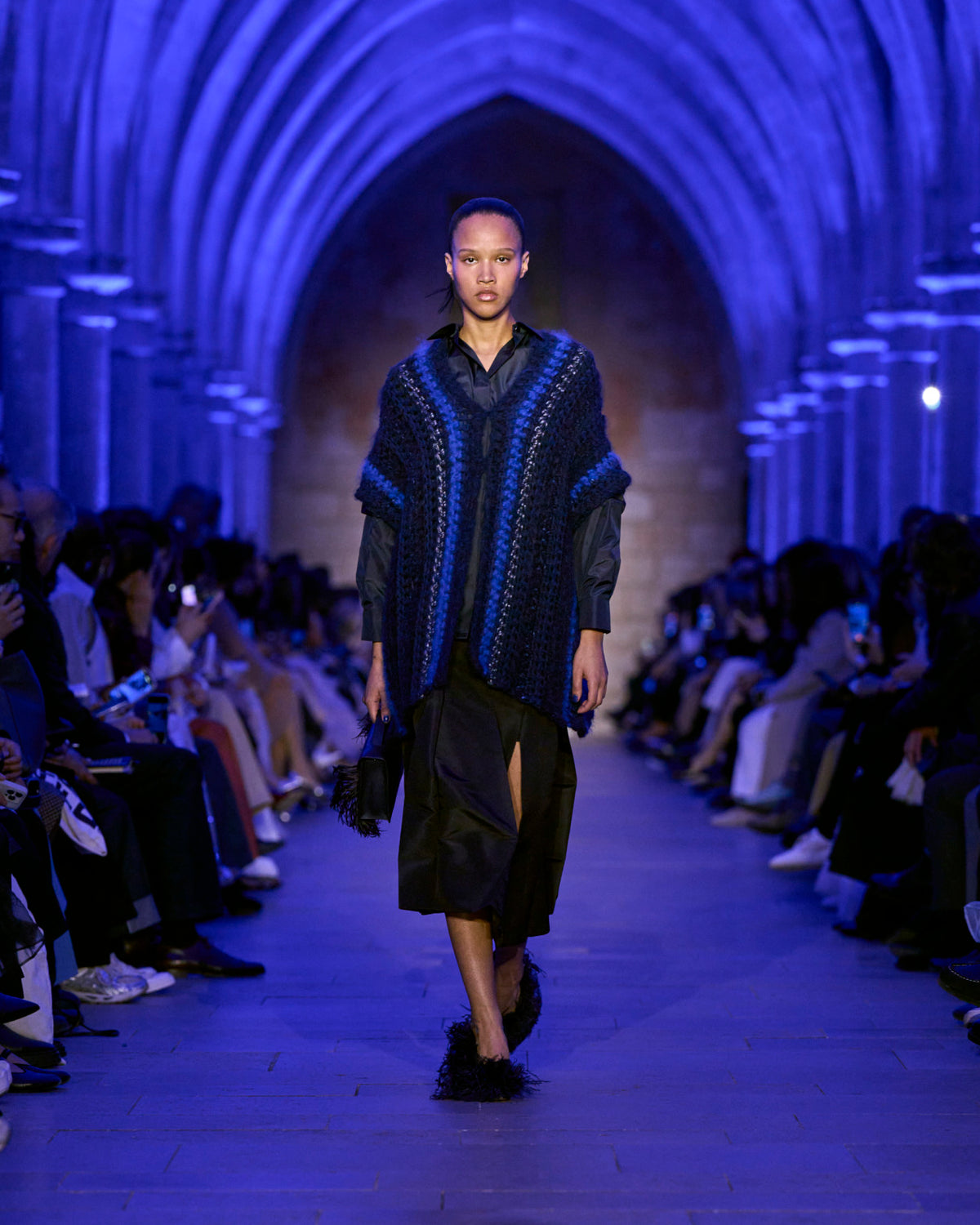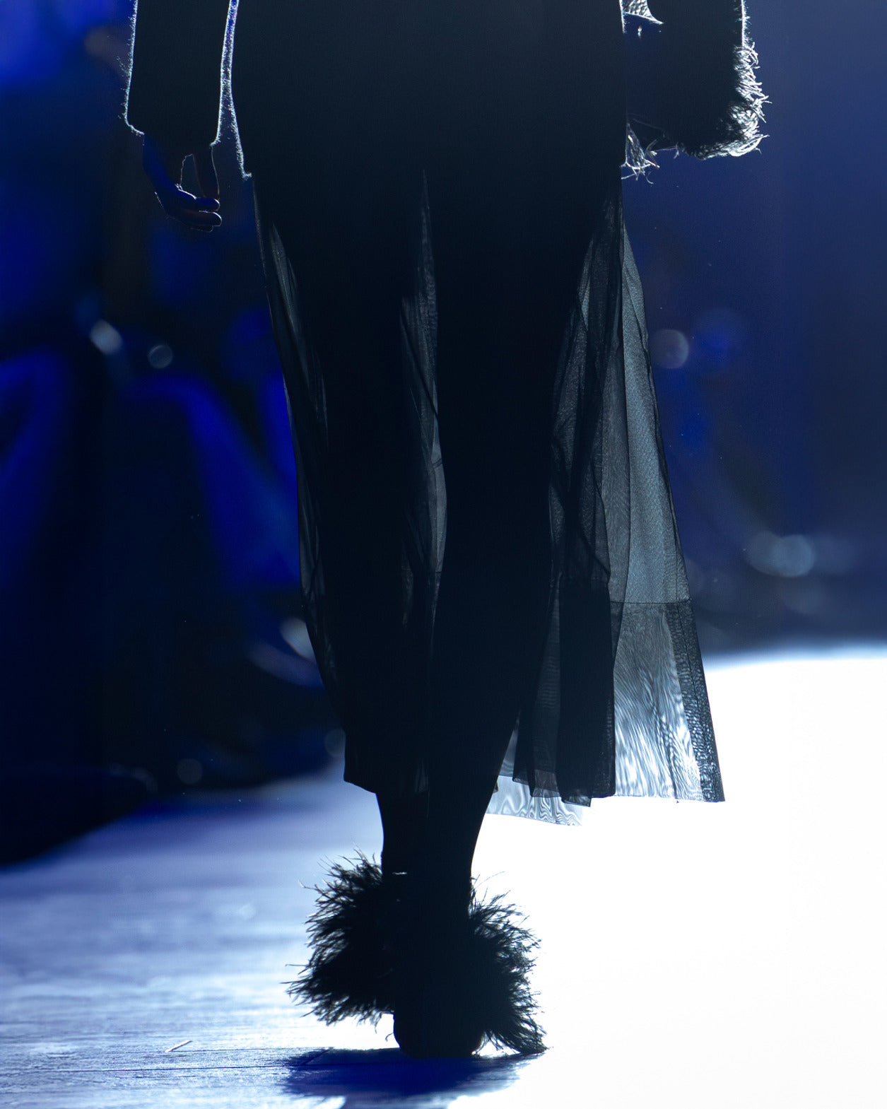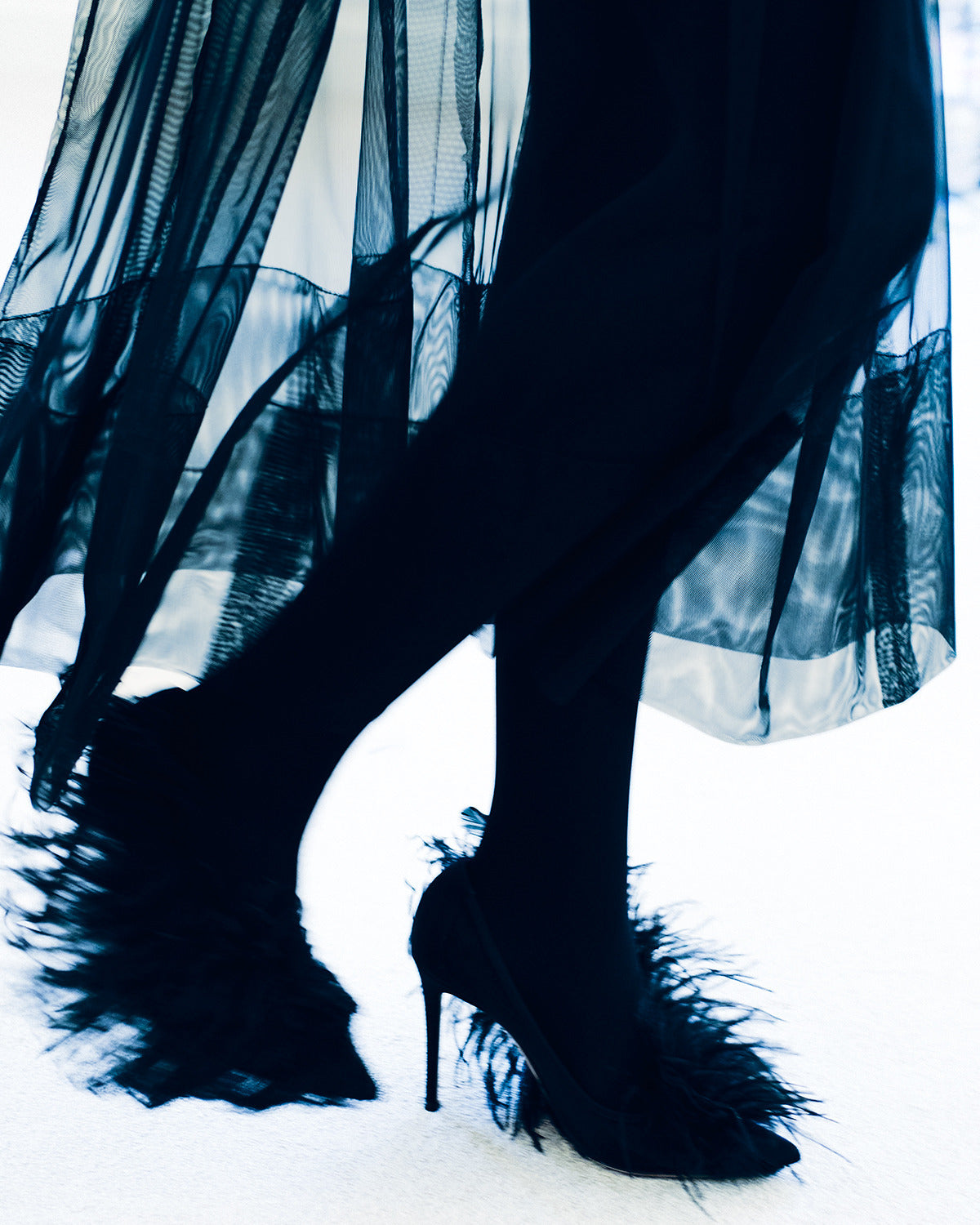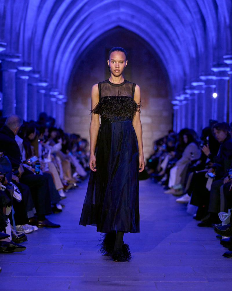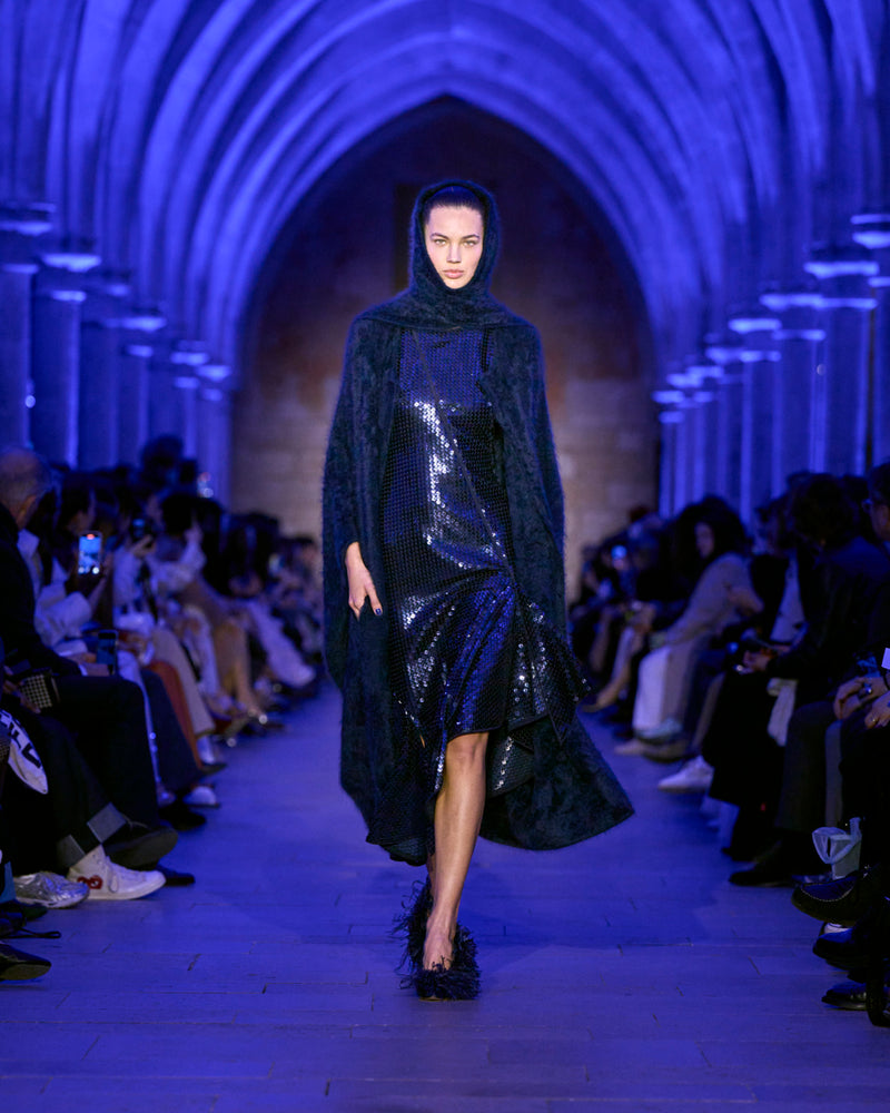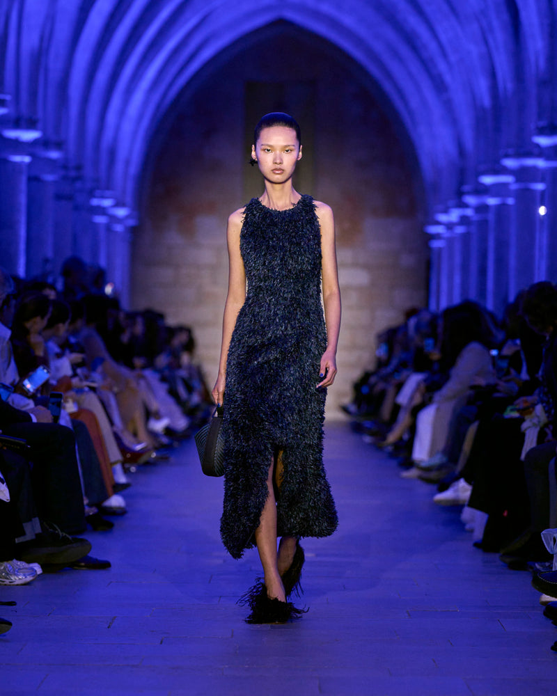Embracing the calm and soft of dusk, textures blur — a knitted wool hoodie and brushed cashmere cape resemble shearling, yet they are not. Wool double-face plaid and plush maxi cord are imbued with a blanket-like sensibility. Taffeta ribbons and airy feathers evolve with movement, continuously changing as they follow the body — right to the next party. Cyanotype prints appear in flashes, as does the new Alice handbag in Akris' DNA of horsehair.