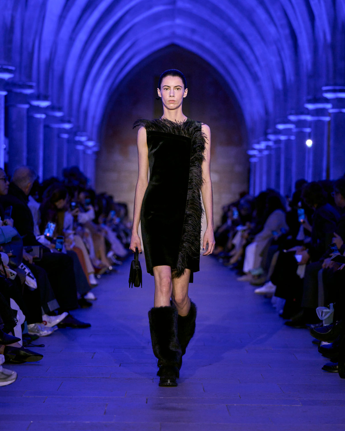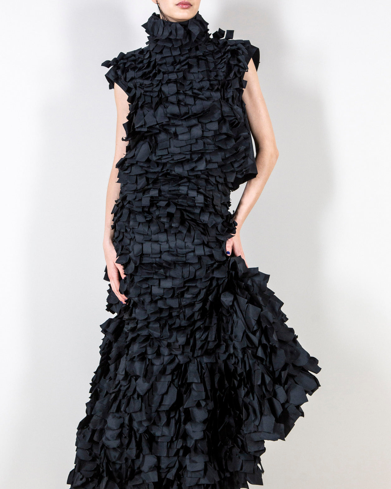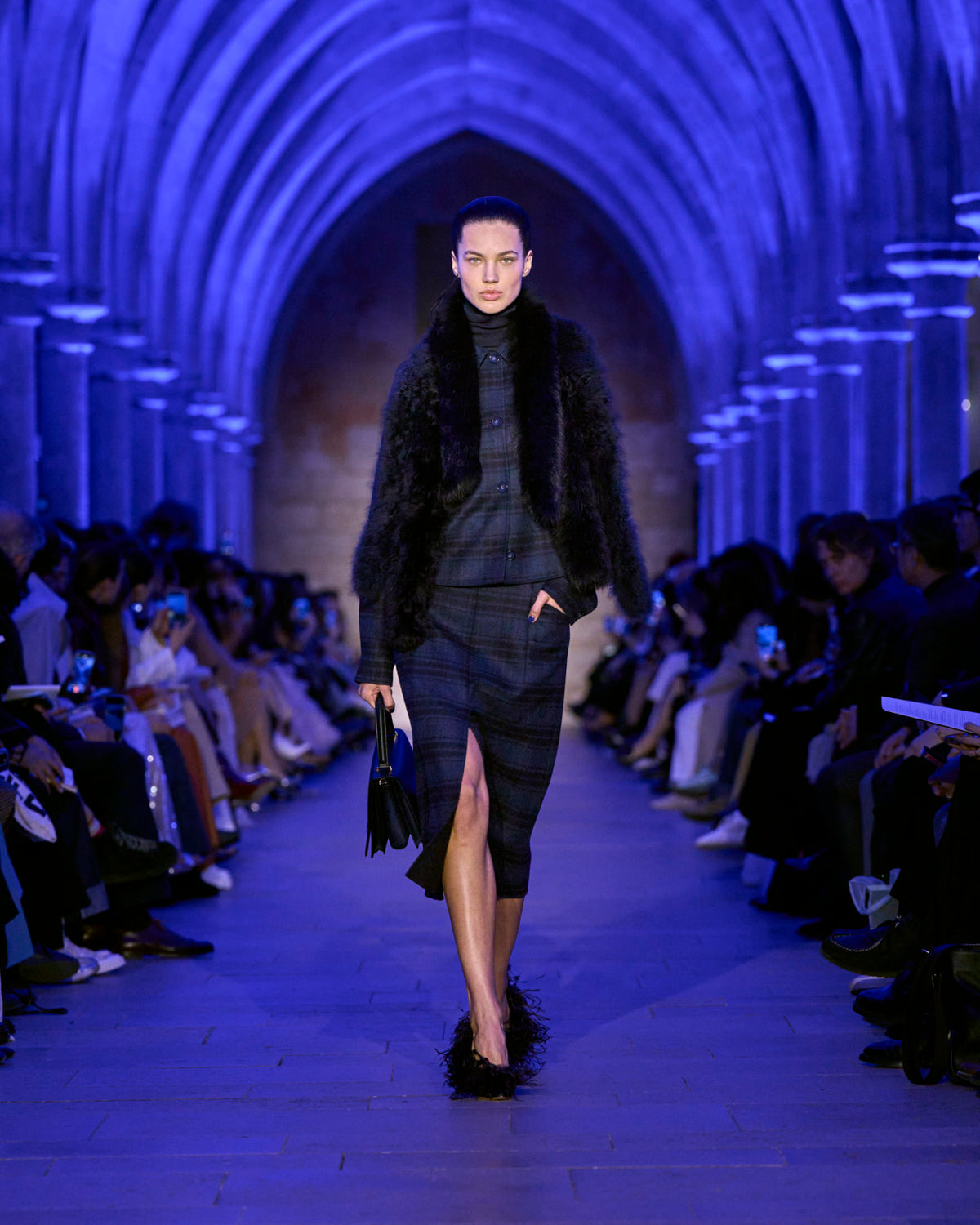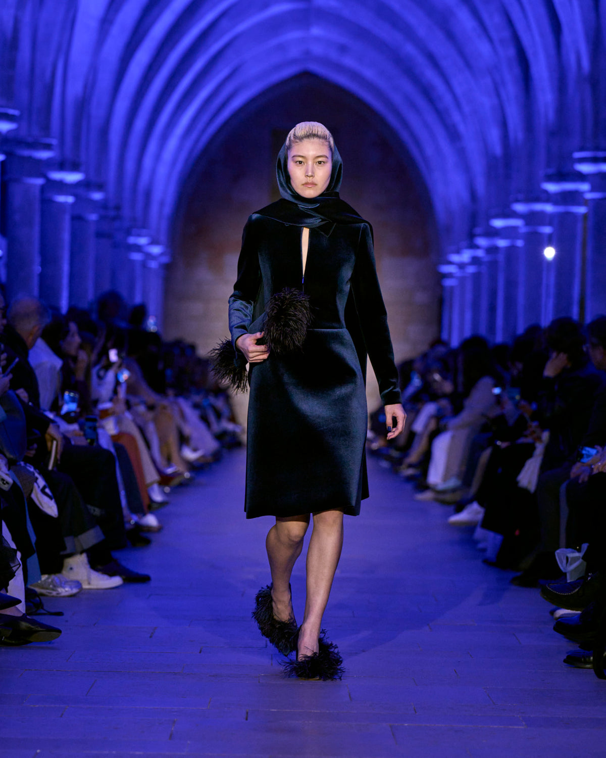 Embracing the calm and soft of dusk, textures blur — a knitted wool hoodie and brushed cashmere cape resemble shearling, yet they are not. Wool double-face plaid and plush maxi cord are imbued with a blanket-like sensibility. Taffeta ribbons and airy feathers evolve with movement, continuously changing as they follow the body — right to the next party. Cyanotype prints appear in flashes, as does the new Alice handbag in Akris' DNA of horsehair.