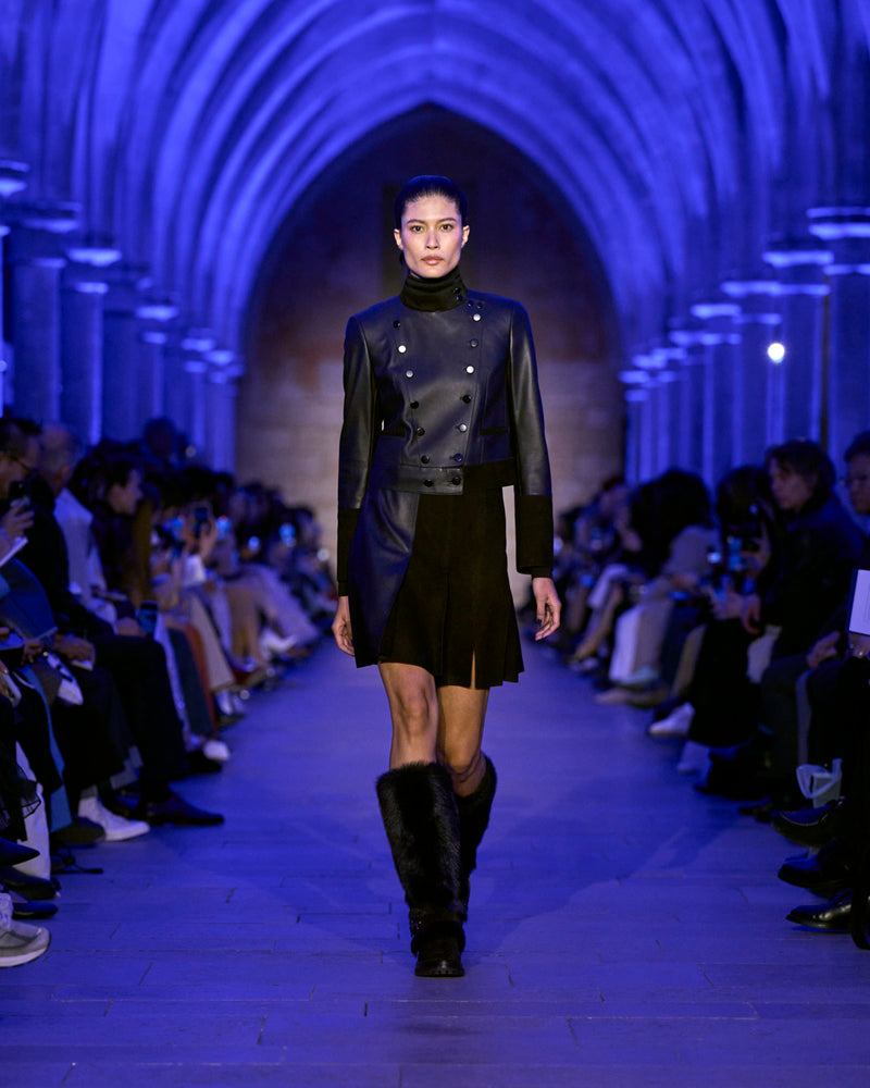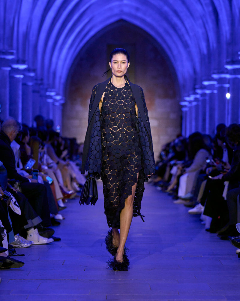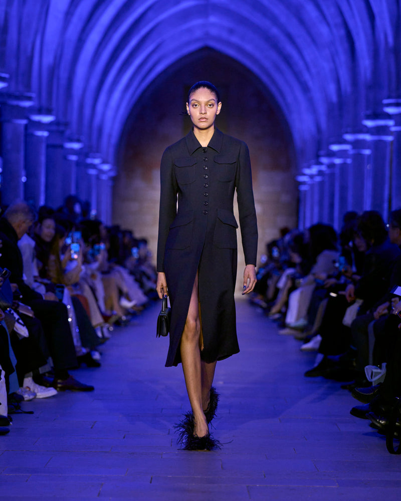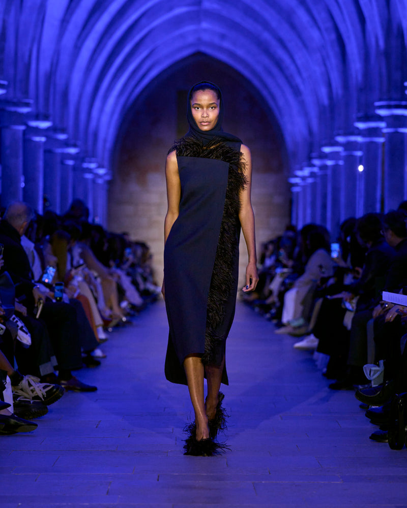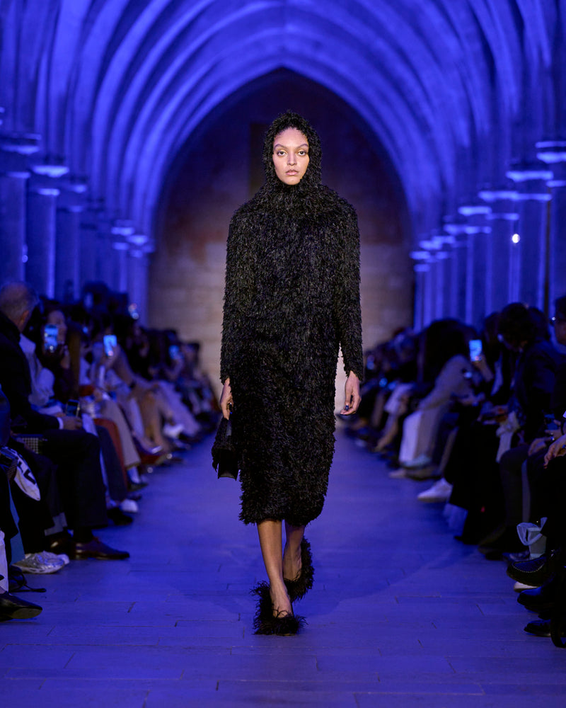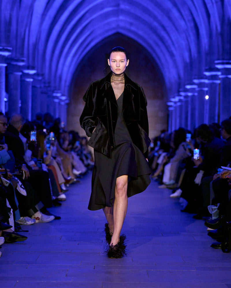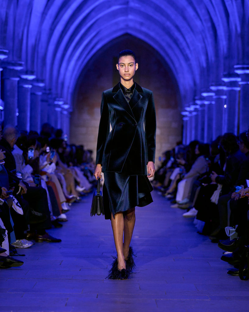 The jacket and coat, signatures of Albert's universe, are not just markers of presence but symbols of transition: an overcoat reimagined in sequins, button-up jackets with wispy feathers, the short Duo trench in ottoman silk. There, fabrics are not just material but a message — for the woman who does not compromise.
