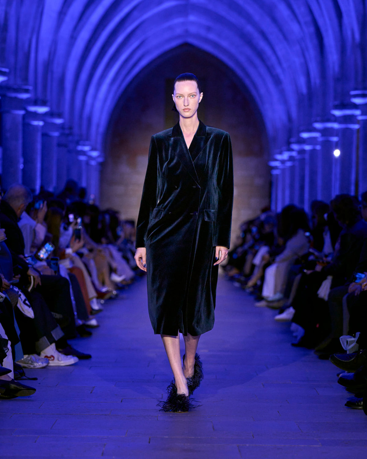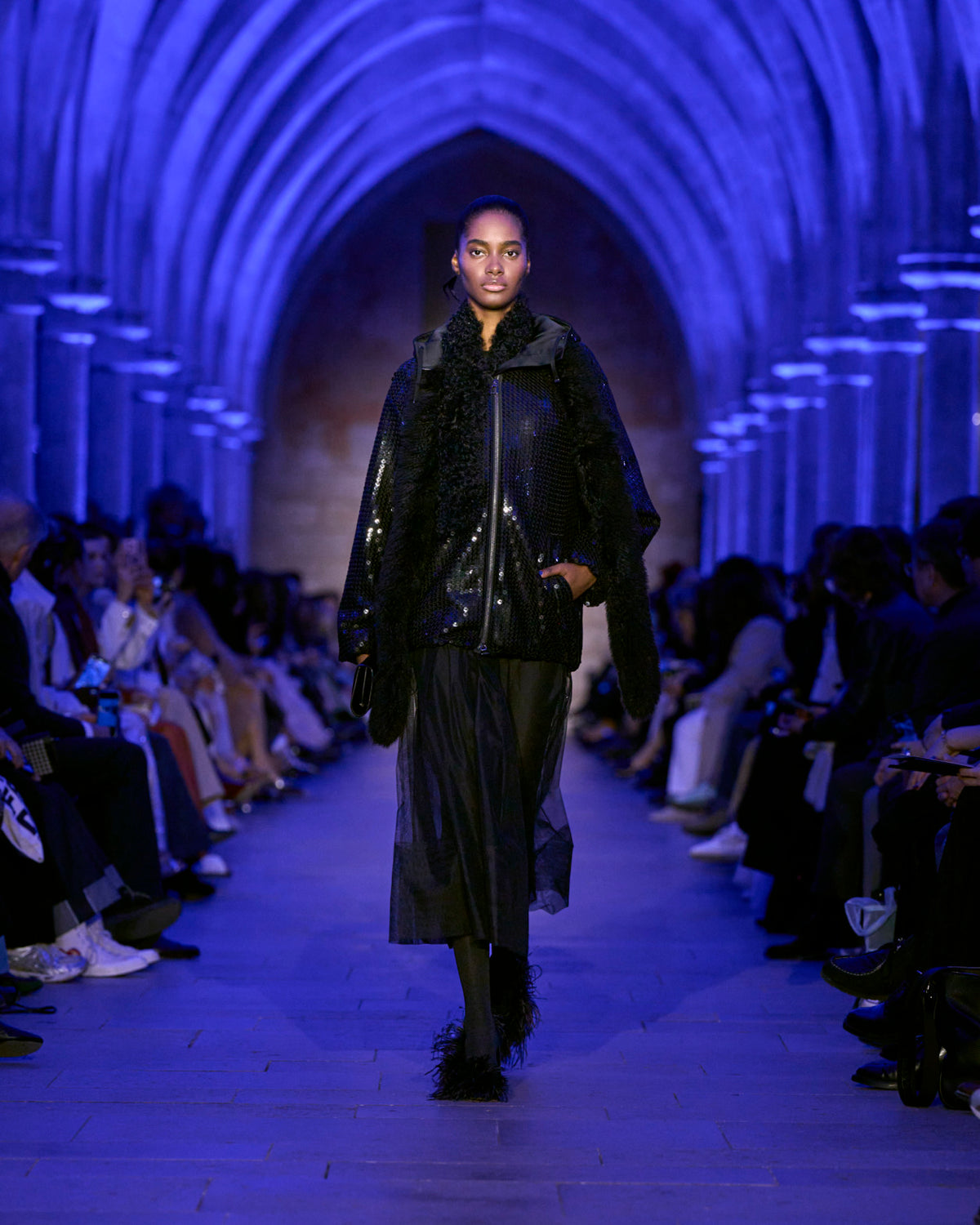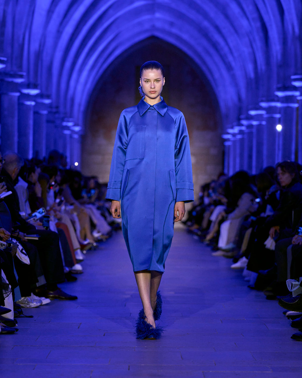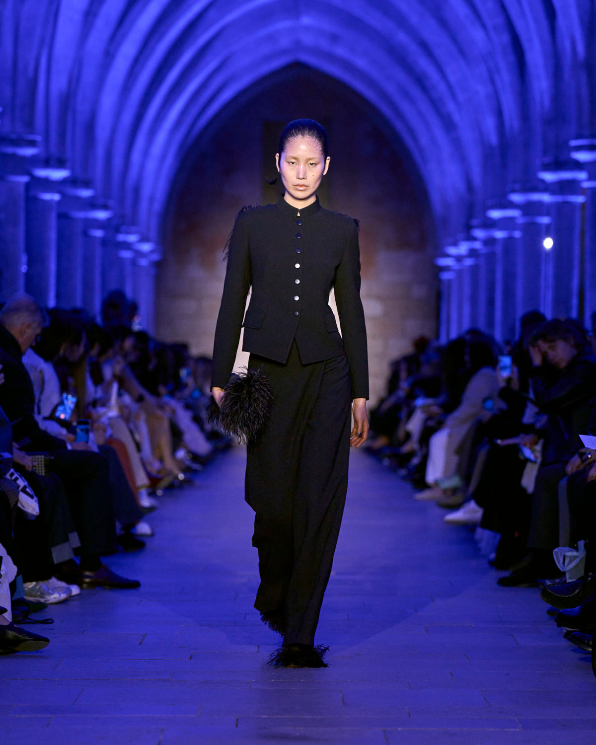 The jacket and coat, signatures of Albert's universe, are not just markers of presence but symbols of transition: an overcoat reimagined in sequins, button-up jackets with wispy feathers, the short Duo trench in ottoman silk. There, fabrics are not just material but a message — for the woman who does not compromise.