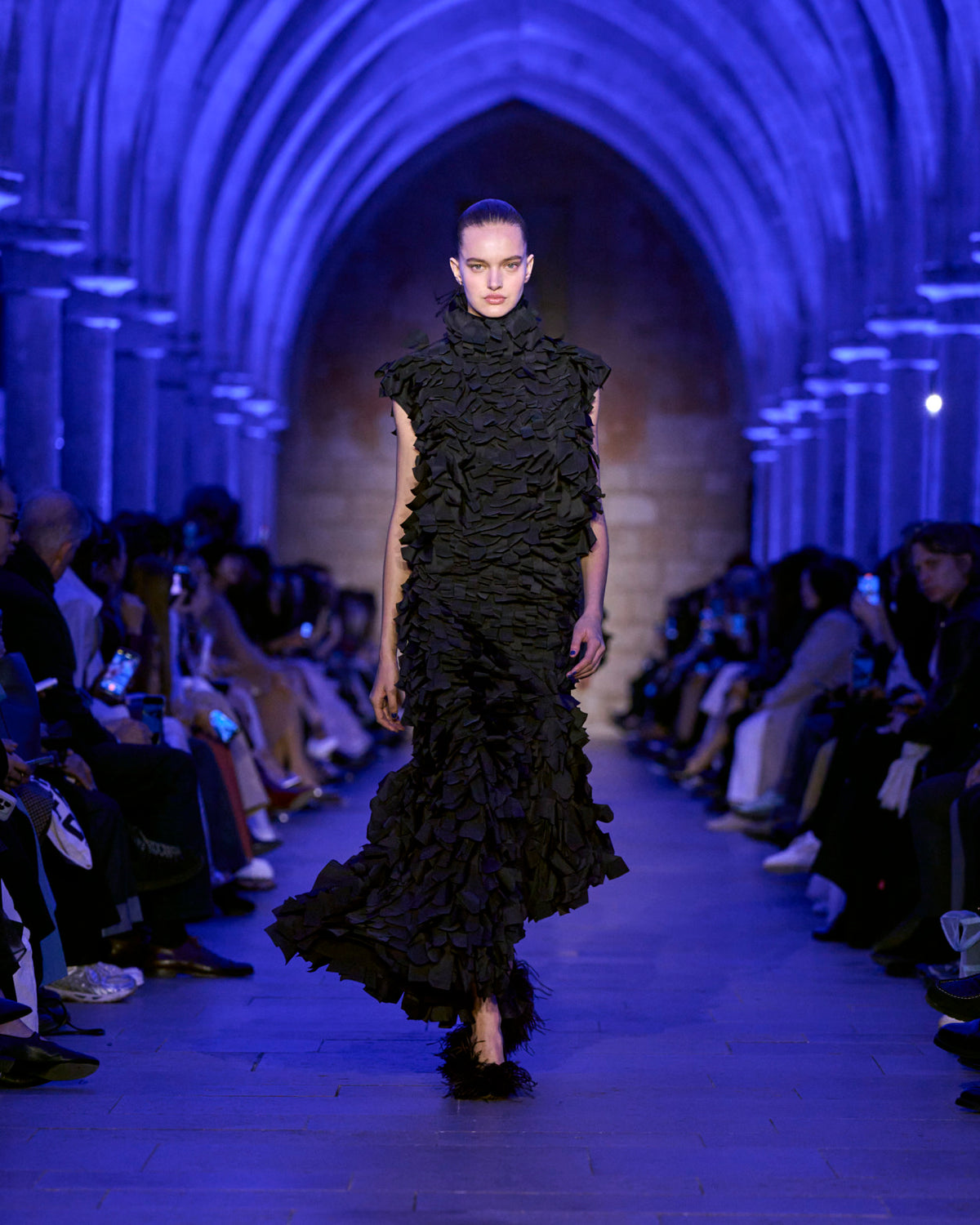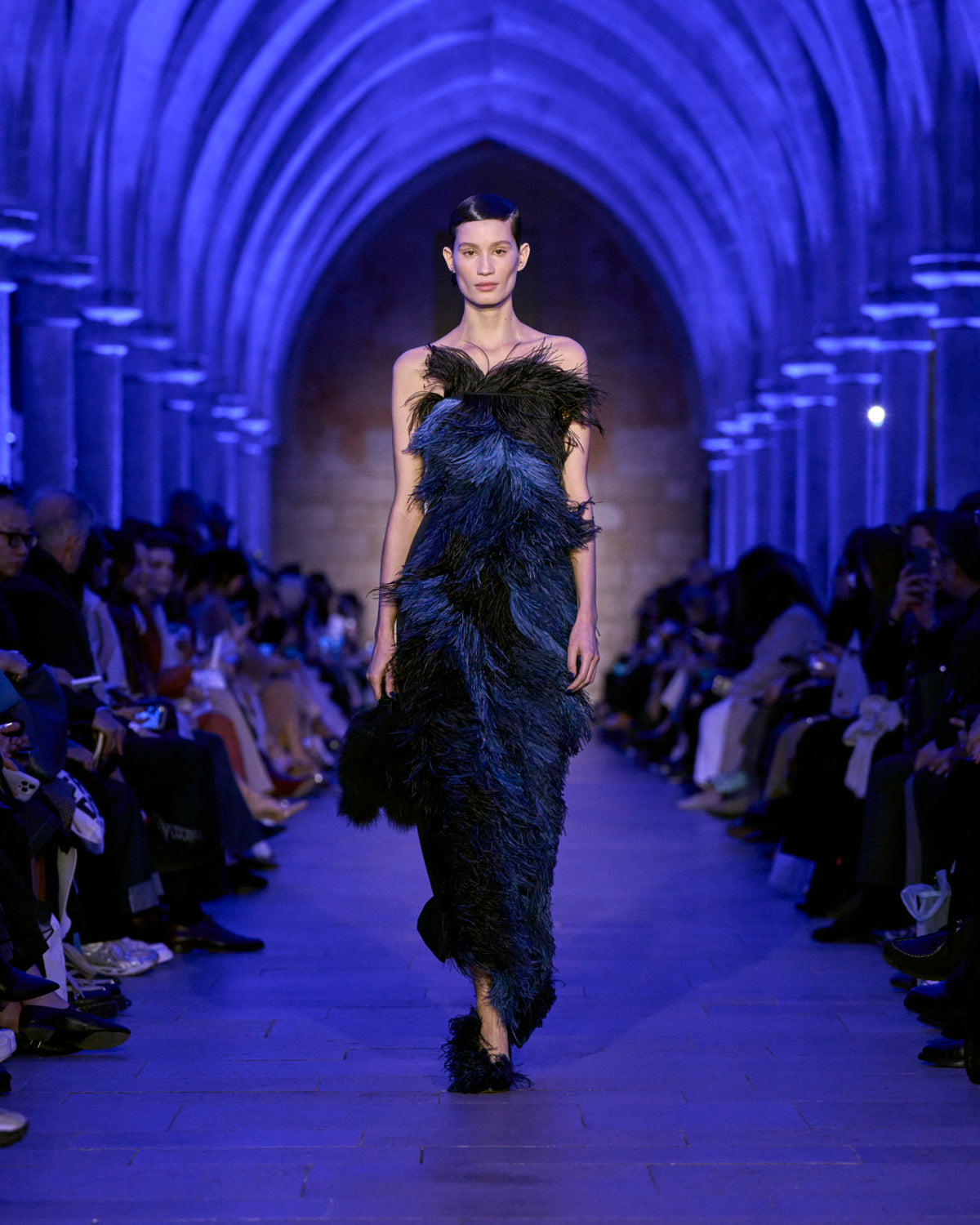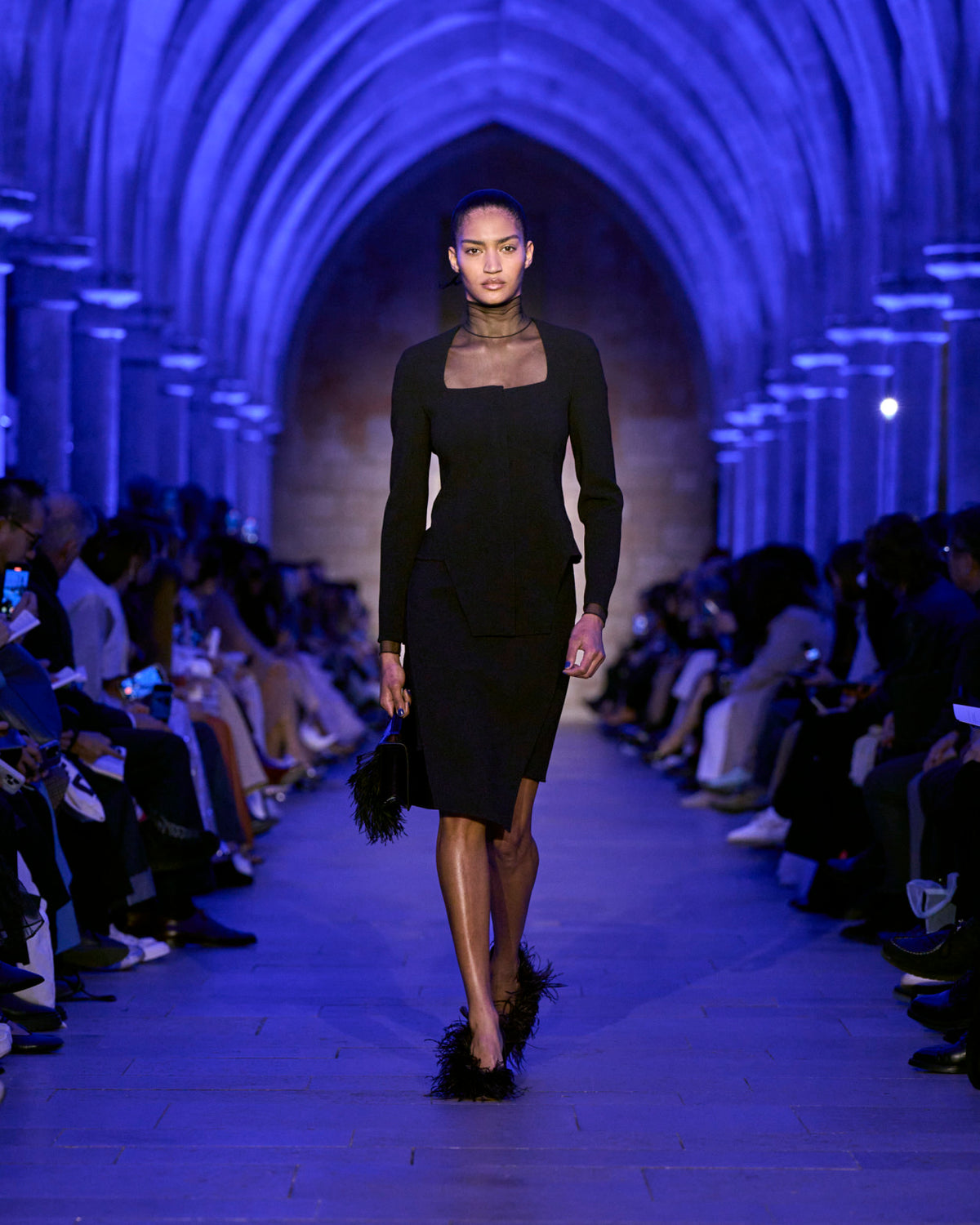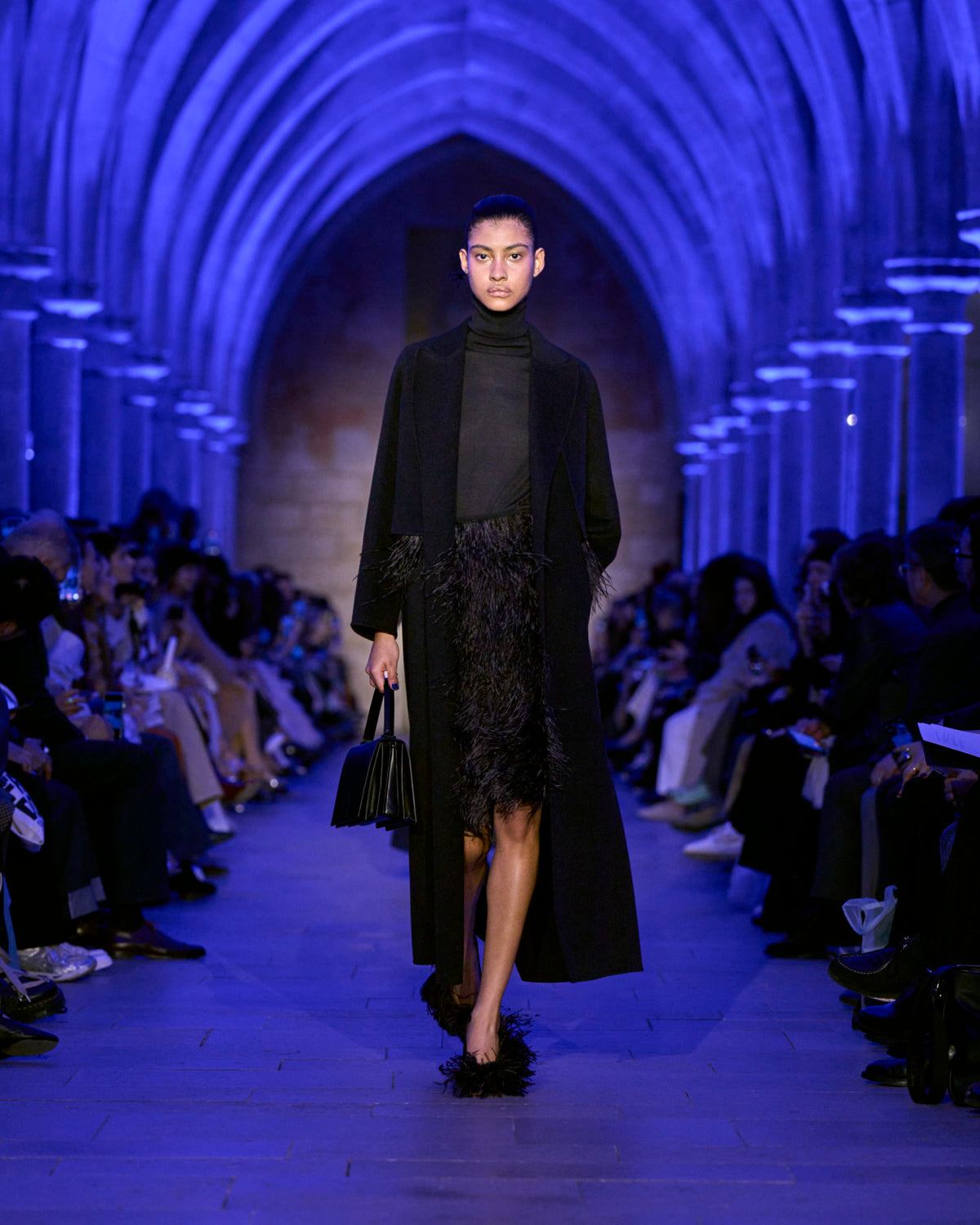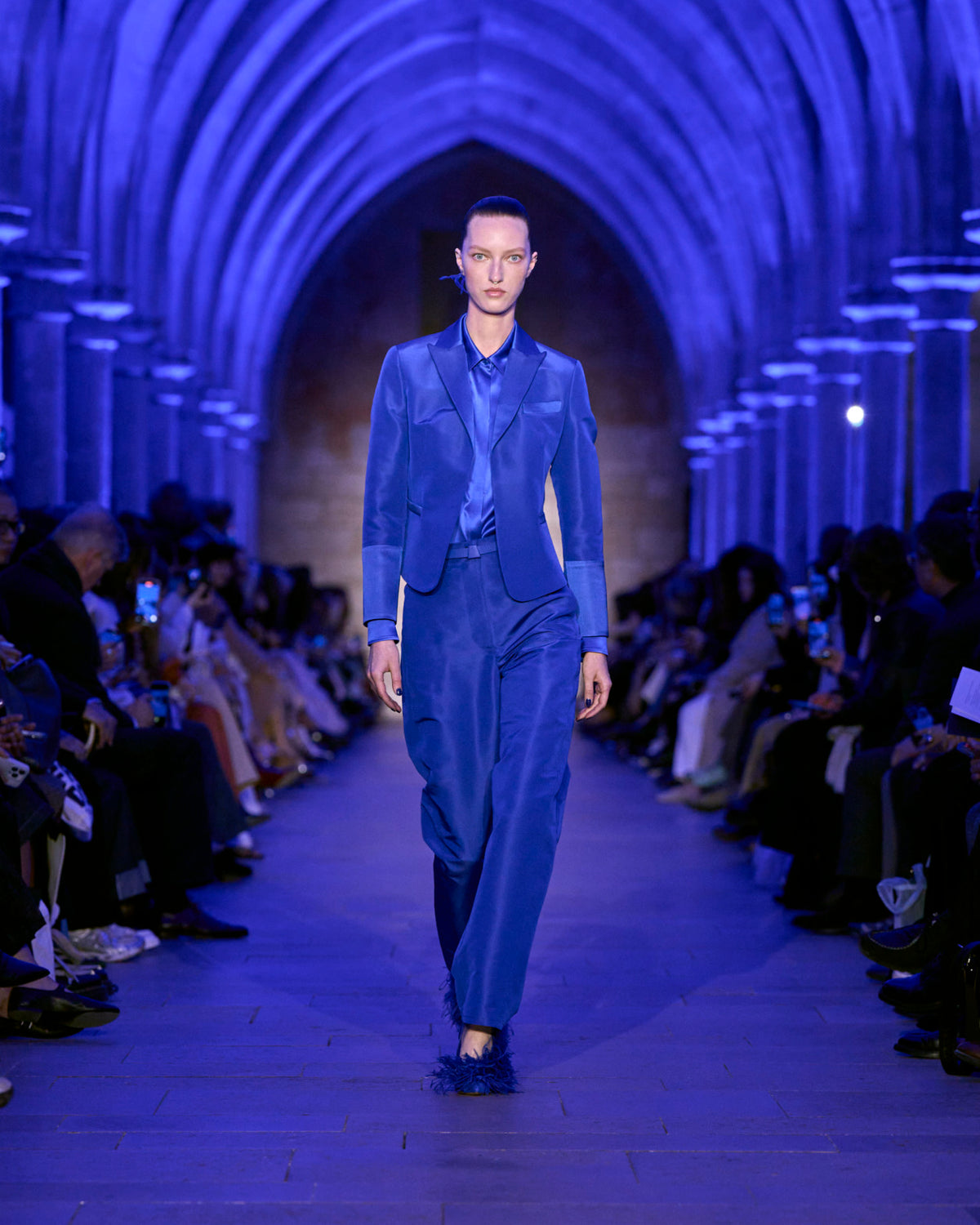 The jacket and coat, signatures of Albert's universe, are not just markers of presence but symbols of transition: an overcoat reimagined in sequins, button-up jackets with wispy feathers, the short Duo trench in ottoman silk. There, fabrics are not just material but a message — for the woman who does not compromise.