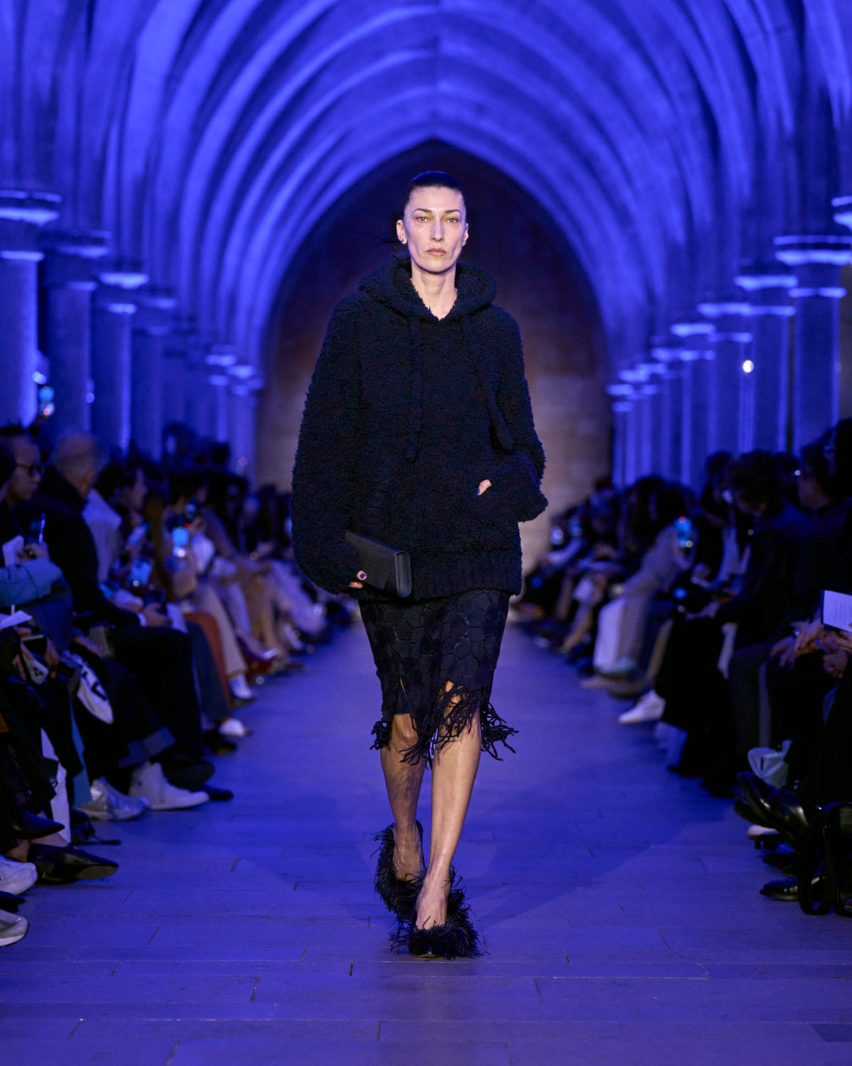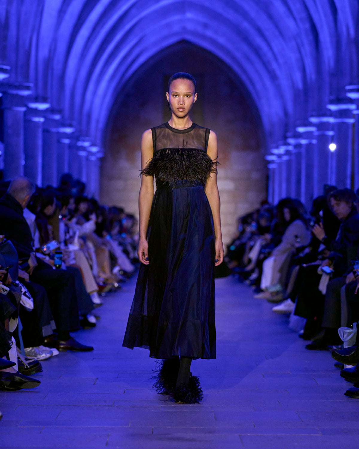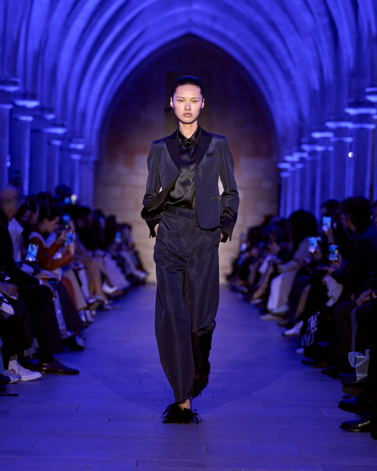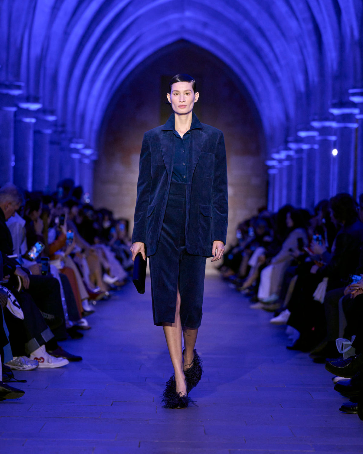The jacket and coat, signatures of Albert's universe, are not just markers of presence but symbols of transition: an overcoat reimagined in sequins, button-up jackets with wispy feathers, the short Duo trench in ottoman silk. There, fabrics are not just material but a message — for the woman who does not compromise.