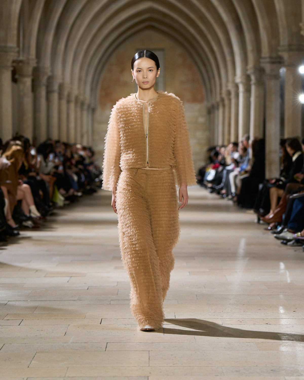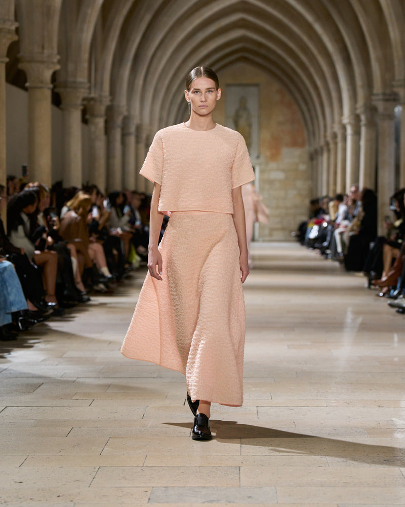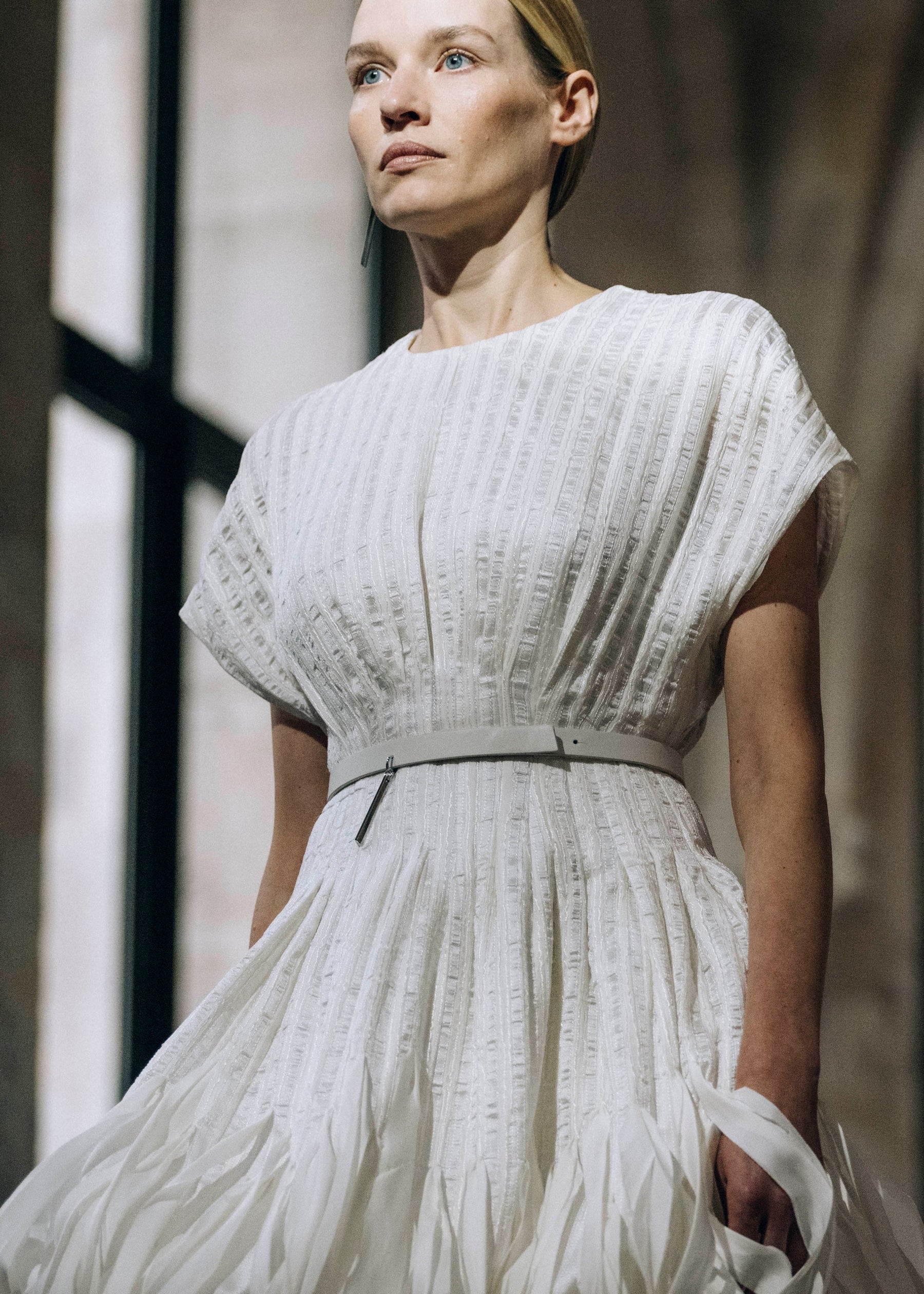 Raffia, the fabric of the moment, enduring and exclusively formulated for lightness and movement. Its texture, reminiscent of Akris' signature horsehair fabric, creating the impression of being carved in bas-relief.