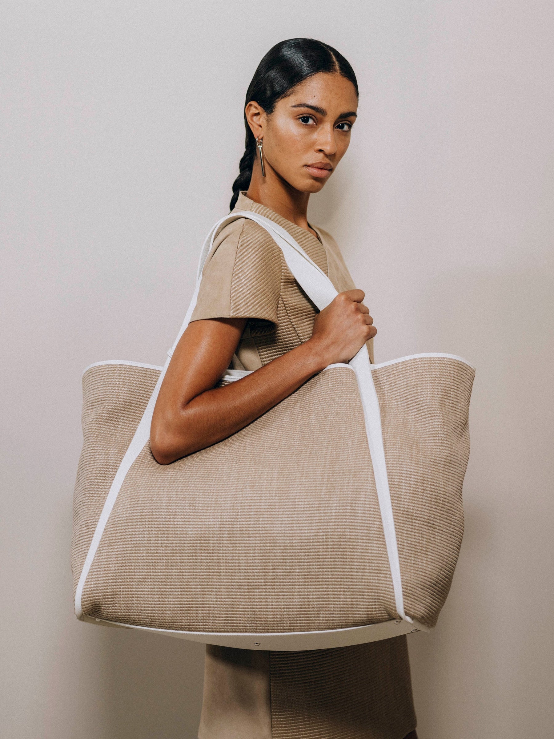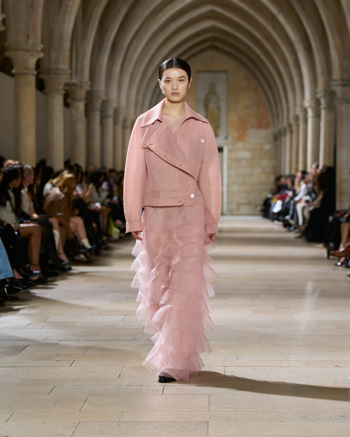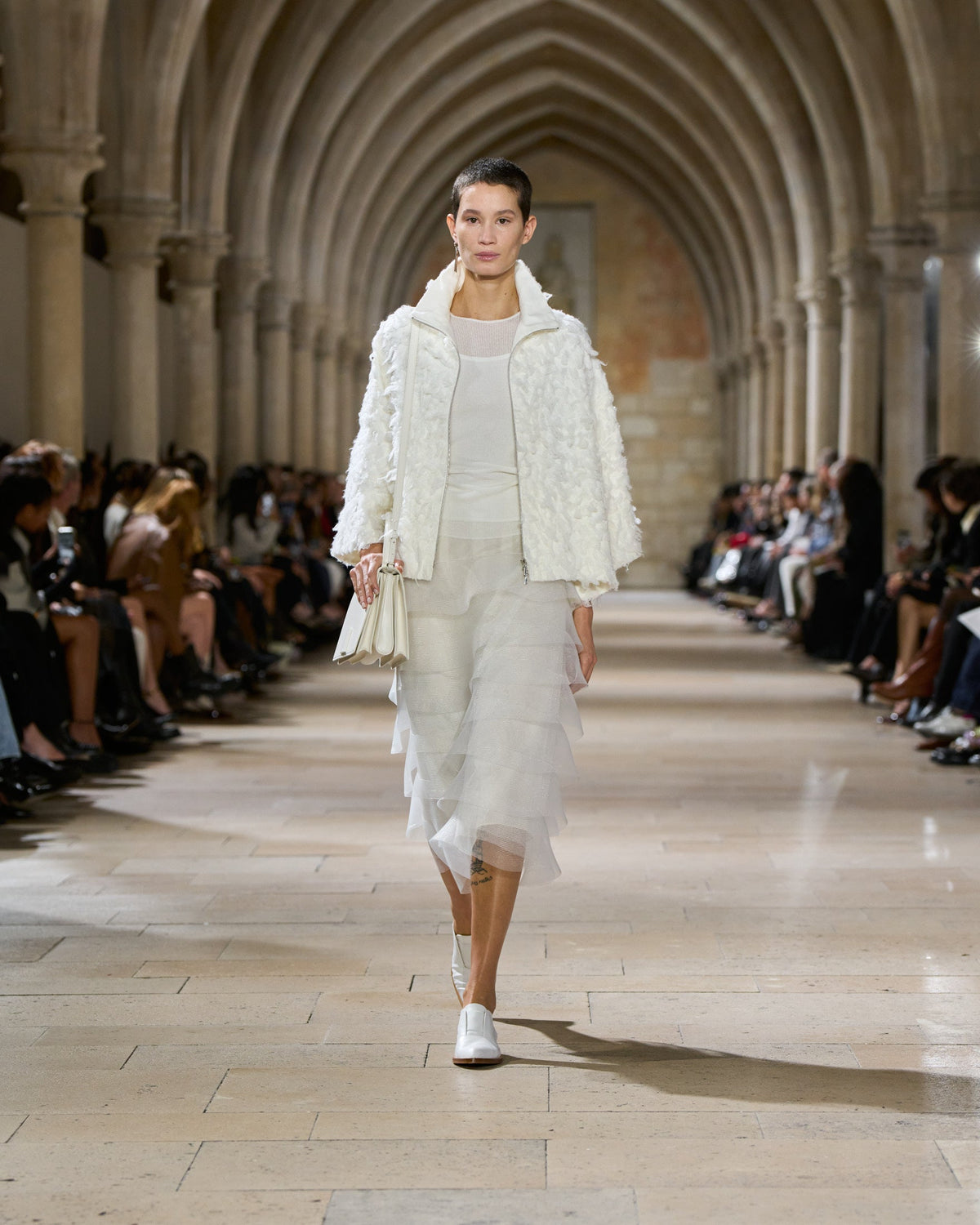 Raffia, the fabric of the moment, enduring and exclusively formulated for lightness and movement. Its texture, reminiscent of Akris' signature horsehair fabric, creating the impression of being carved in bas-relief.