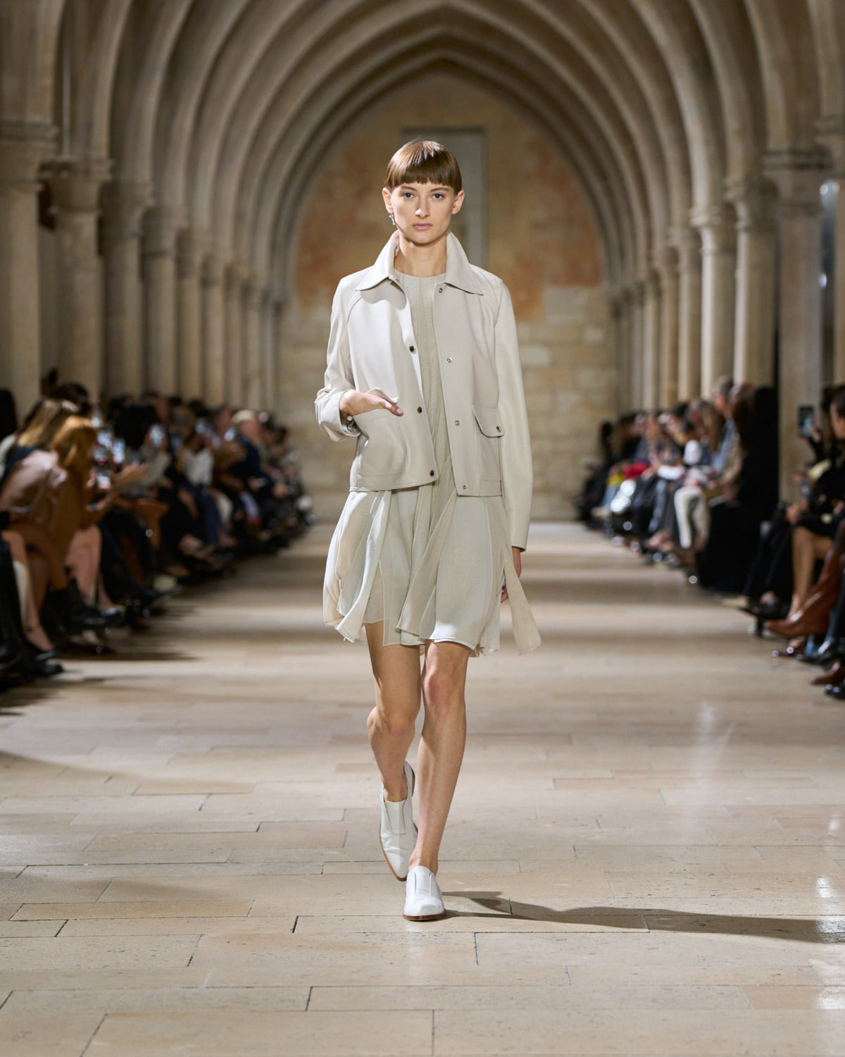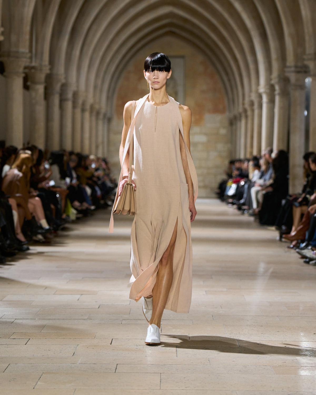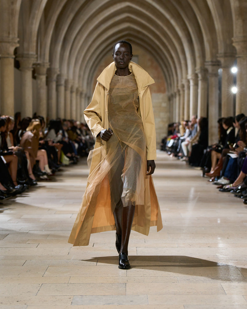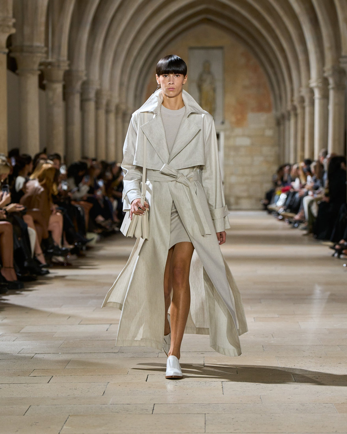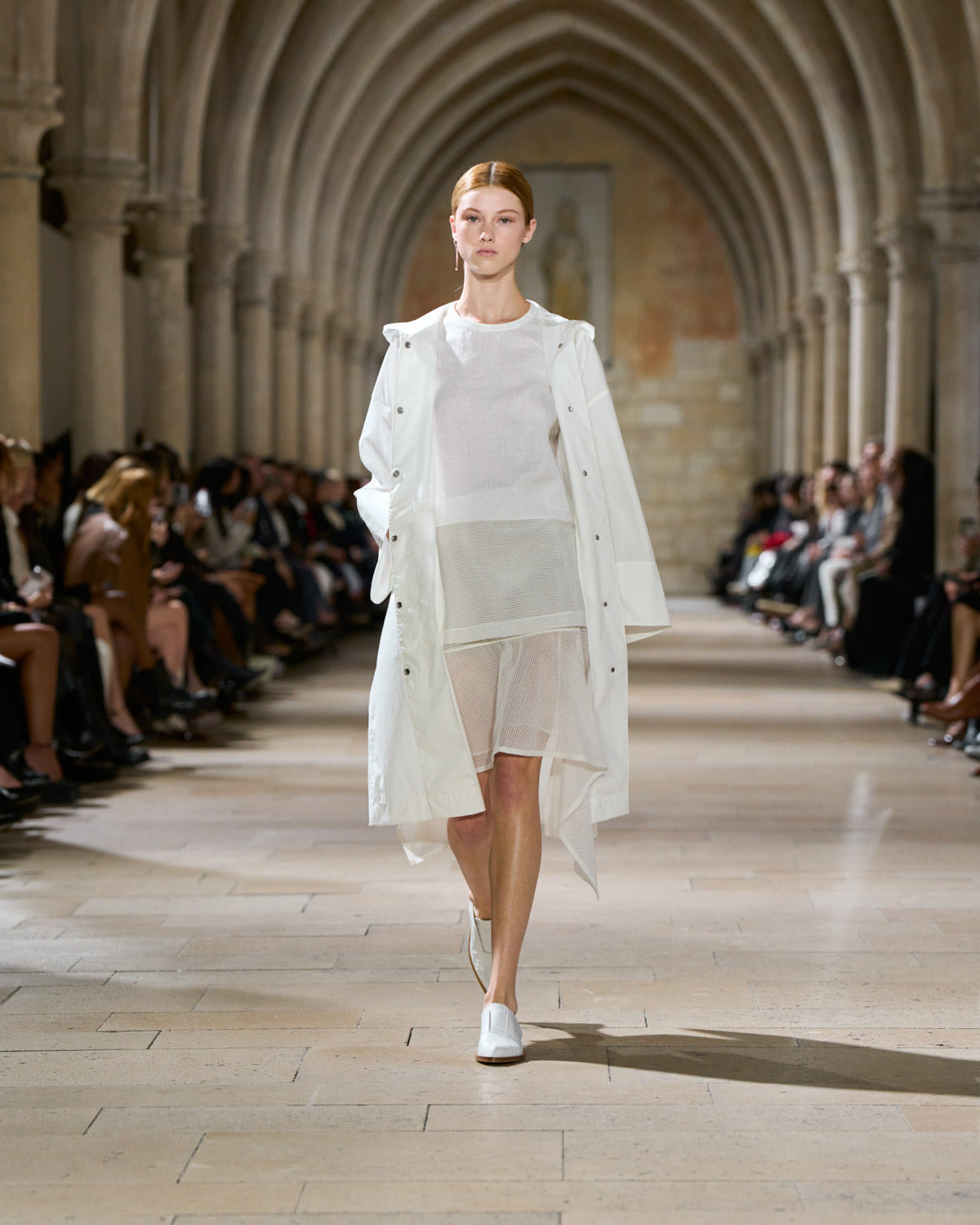 Juxtaposing flou and pragmatism. Elongated, fluid dresses grounded in trench coats and parkas for a feeling of protection and outdoorsy sleekness. Resin-coated, water-repellent, in fabrics that feel light: linen-blend, cotton, and silk poplin. Sporty ease expressed through double-layered tank tops, with a woman in action always present.