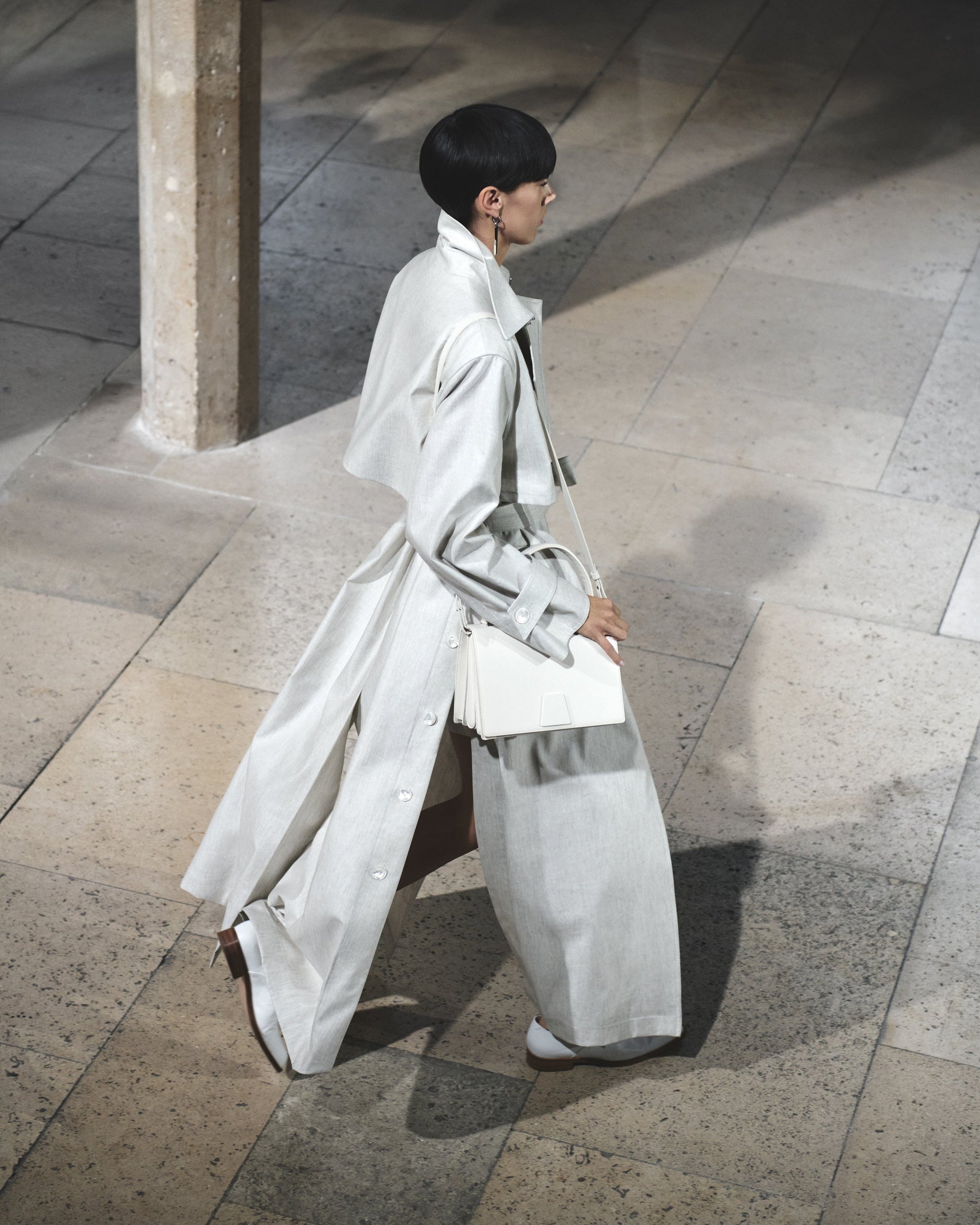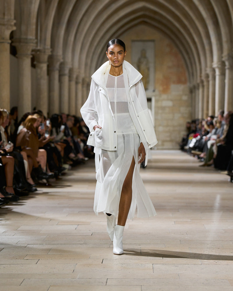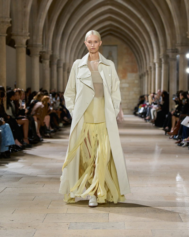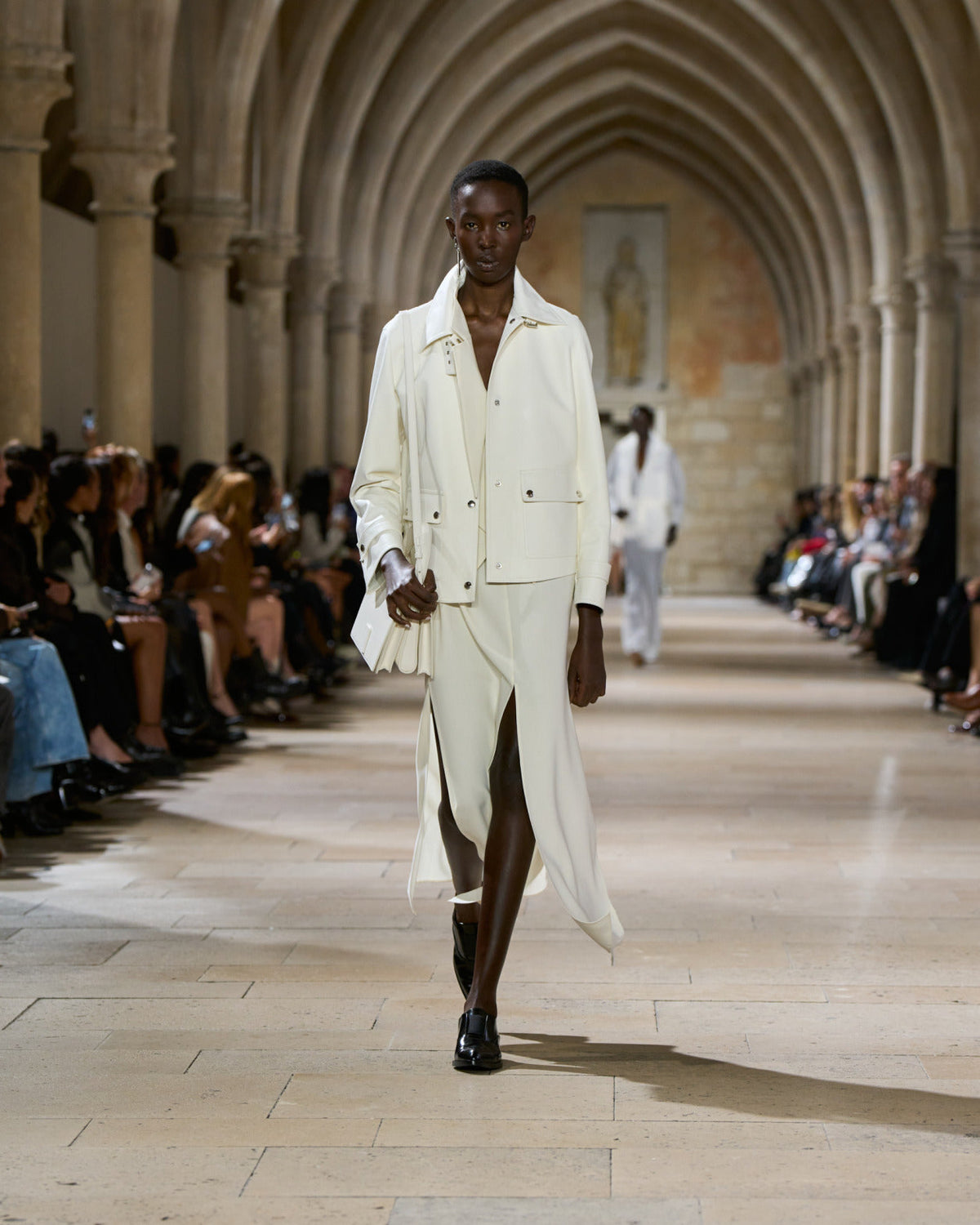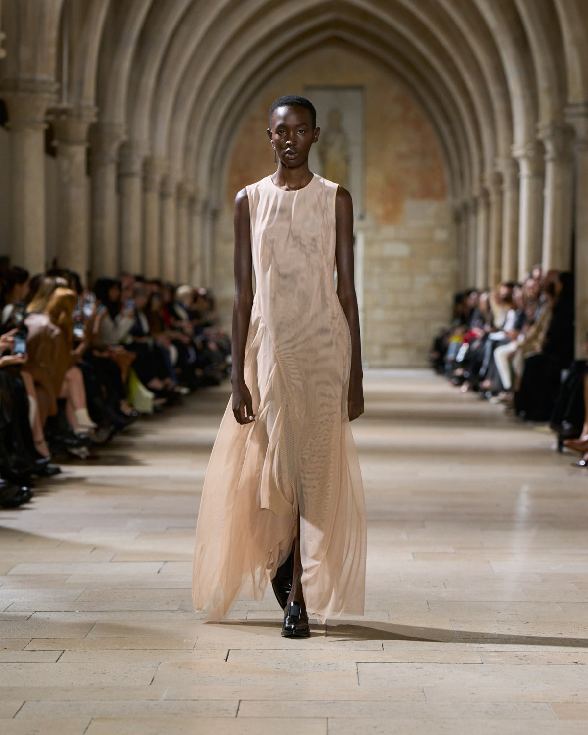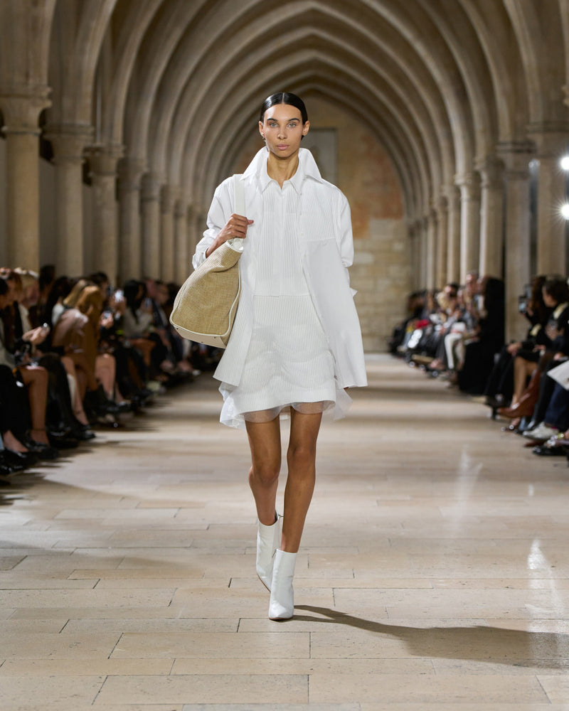 Juxtaposing flou and pragmatism. Elongated, fluid dresses grounded in trench coats and parkas for a feeling of protection and outdoorsy sleekness. Resin-coated, water-repellent, in fabrics that feel light: linen-blend, cotton, and silk poplin. Sporty ease expressed through double-layered tank tops, with a woman in action always present.