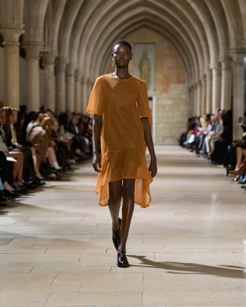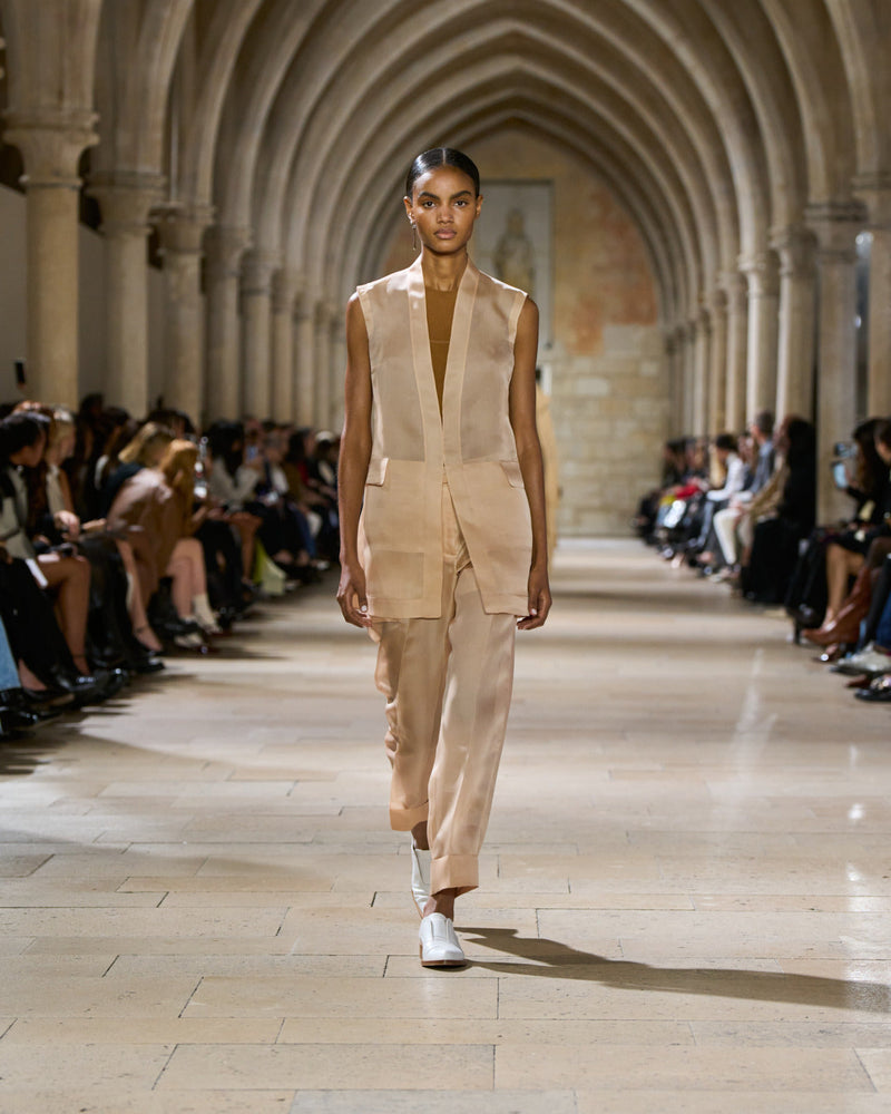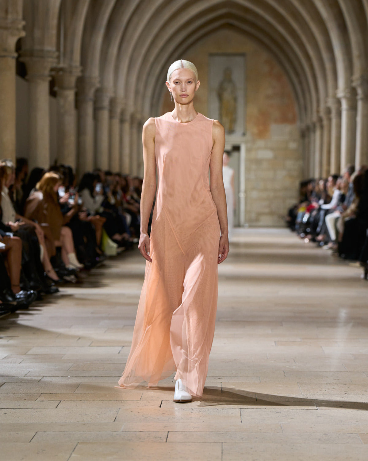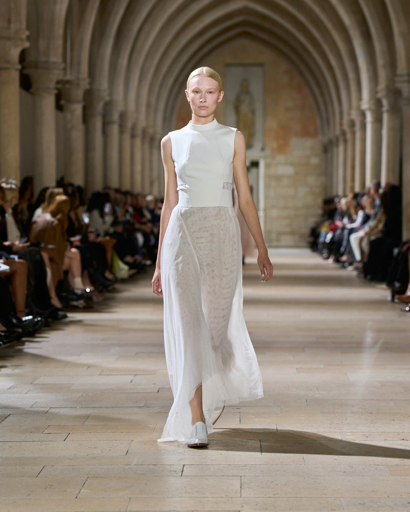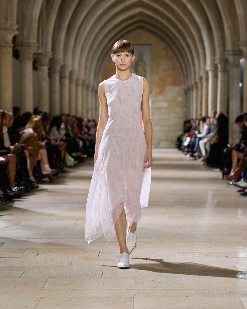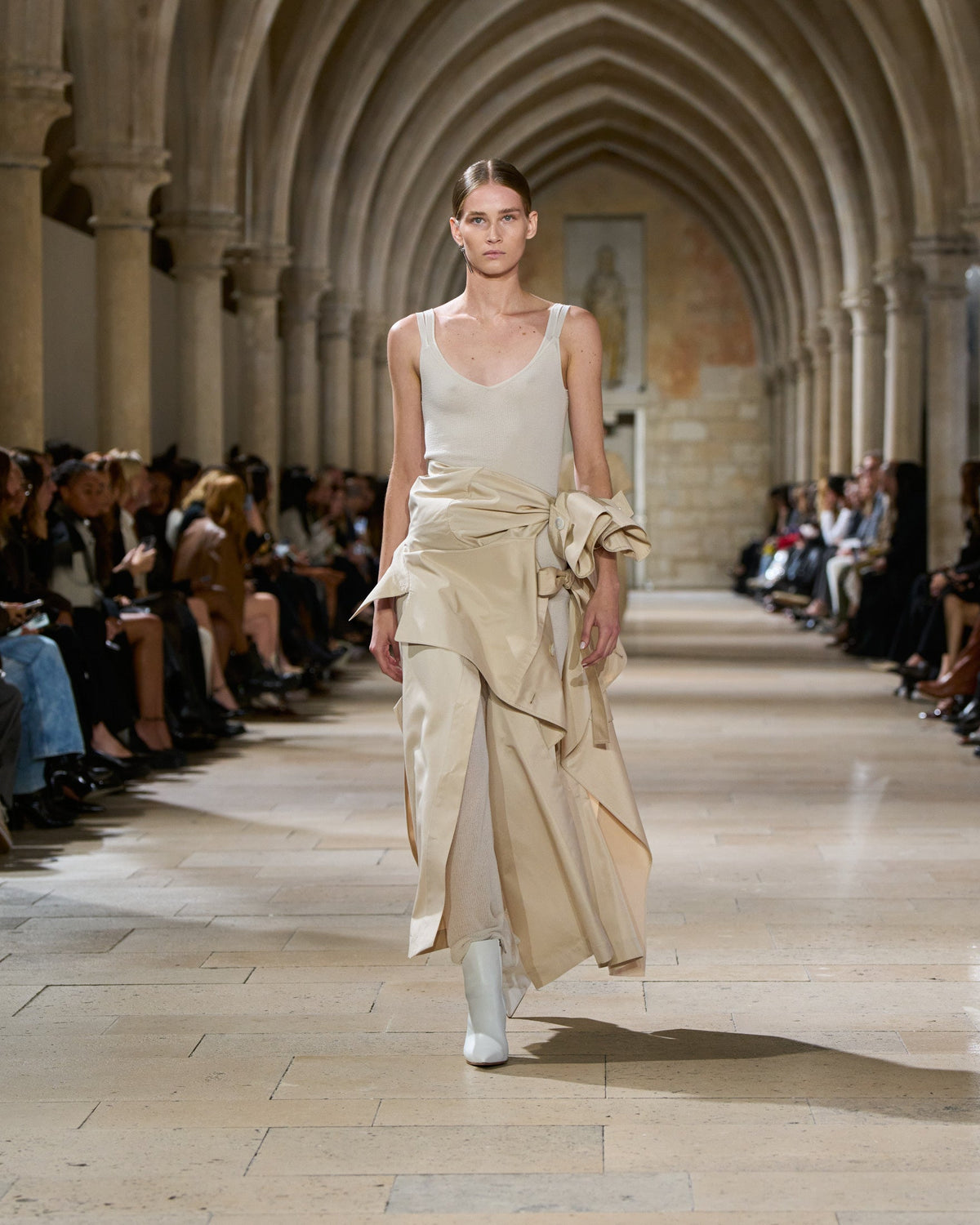 Juxtaposing flou and pragmatism. Elongated, fluid dresses grounded in trench coats and parkas for a feeling of protection and outdoorsy sleekness. Resin-coated, water-repellent, in fabrics that feel light: linen-blend, cotton, and silk poplin. Sporty ease expressed through double-layered tank tops, with a woman in action always present.