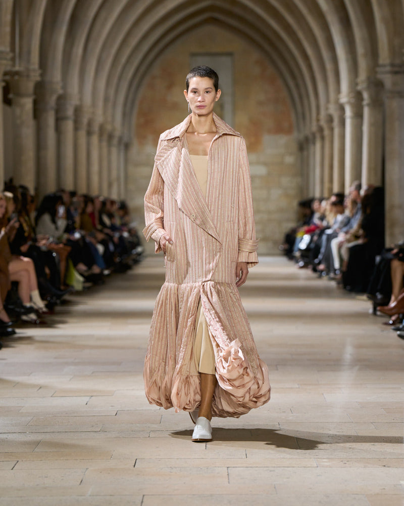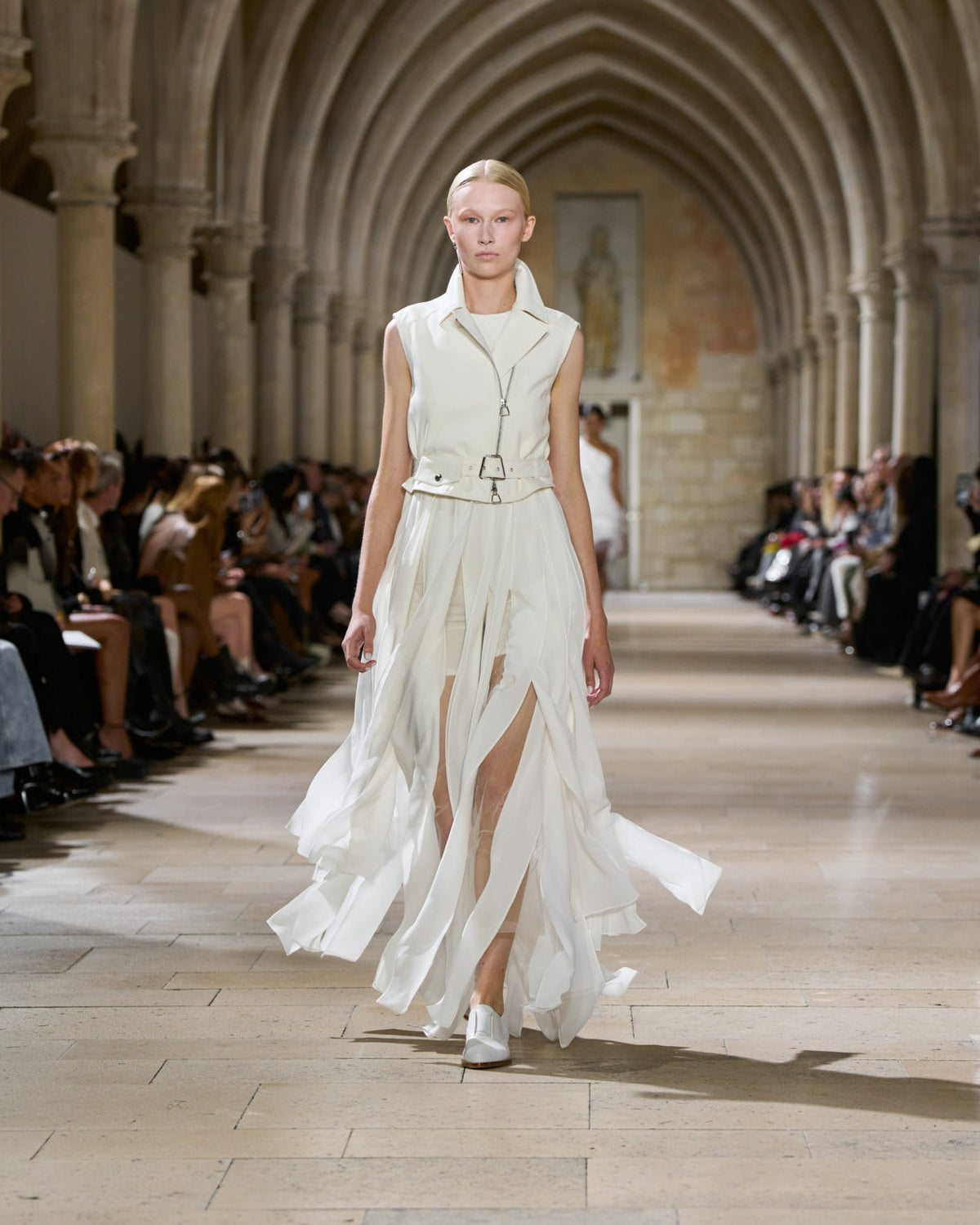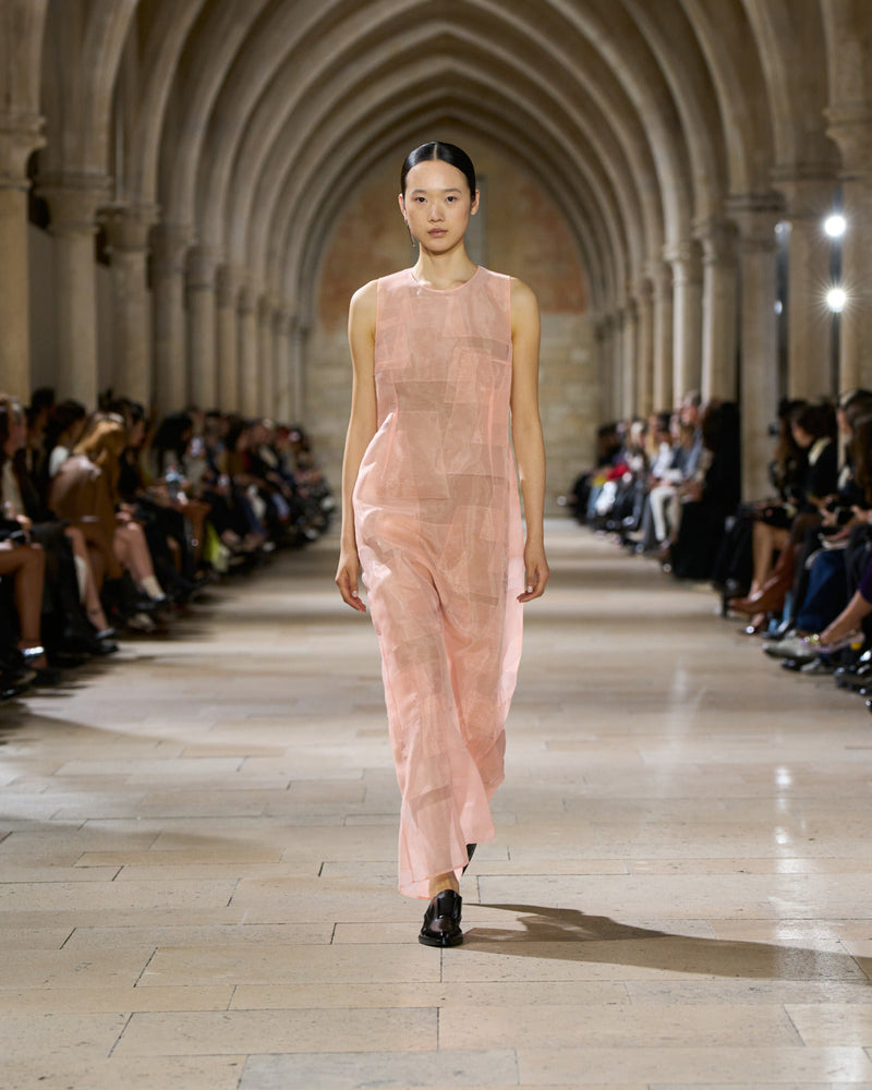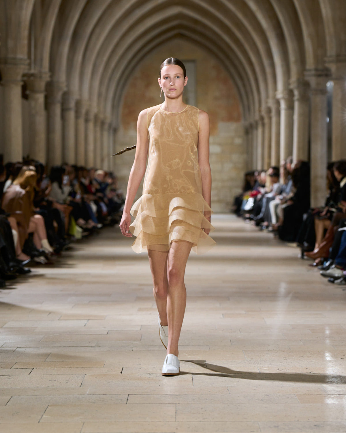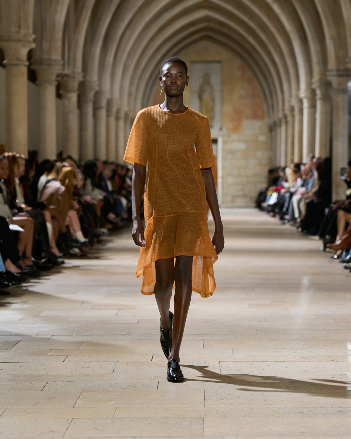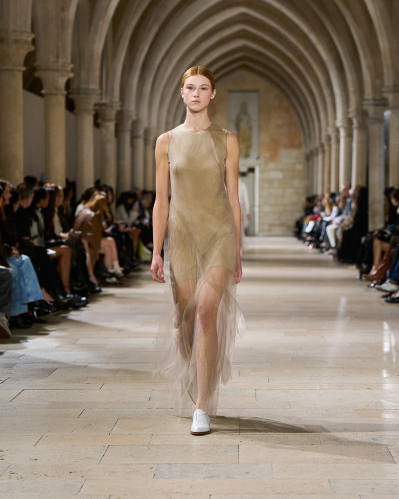 Juxtaposing flou and pragmatism. Elongated, fluid dresses grounded in trench coats and parkas for a feeling of protection and outdoorsy sleekness. Resin-coated, water-repellent, in fabrics that feel light: linen-blend, cotton, and silk poplin. Sporty ease expressed through double-layered tank tops, with a woman in action always present.