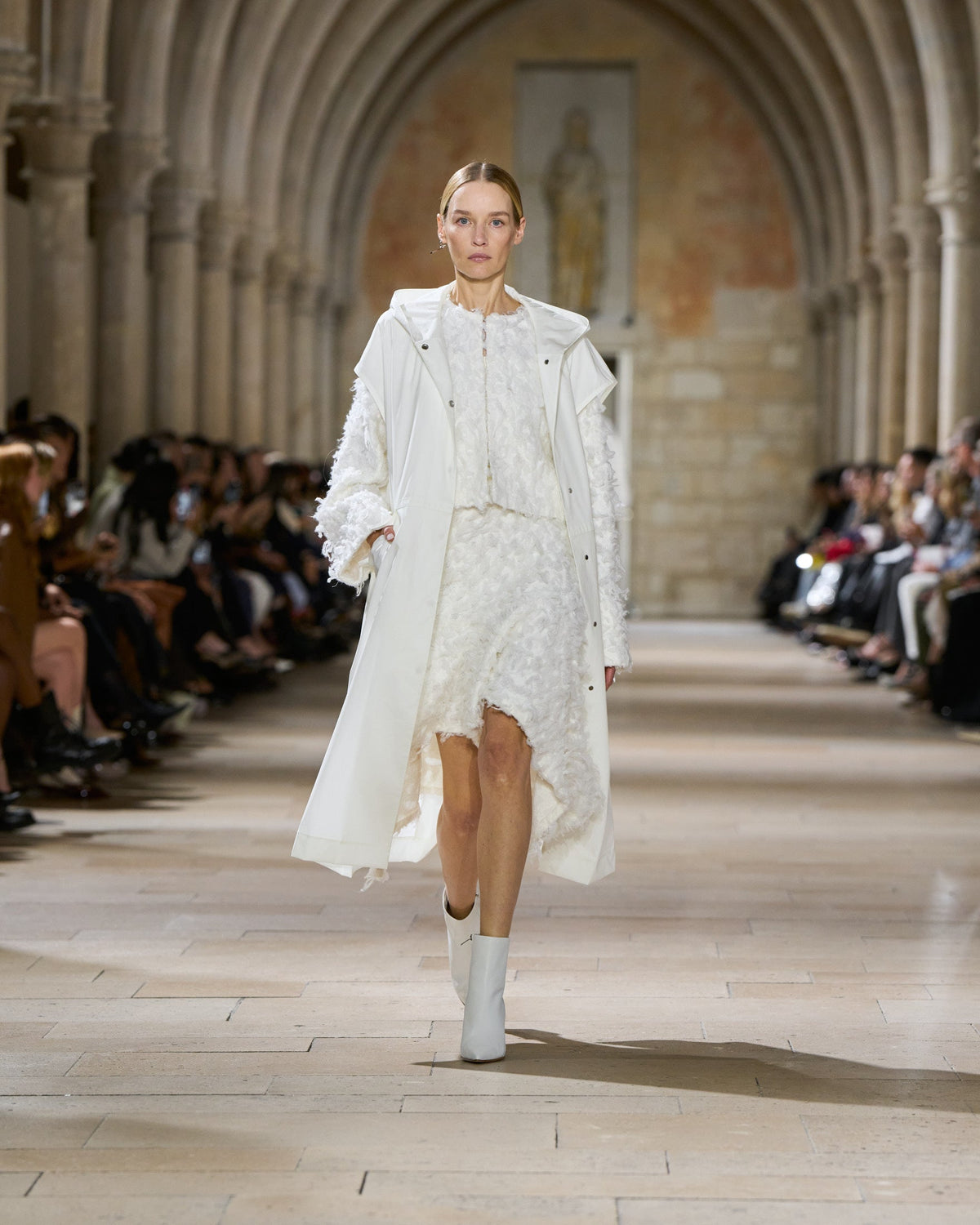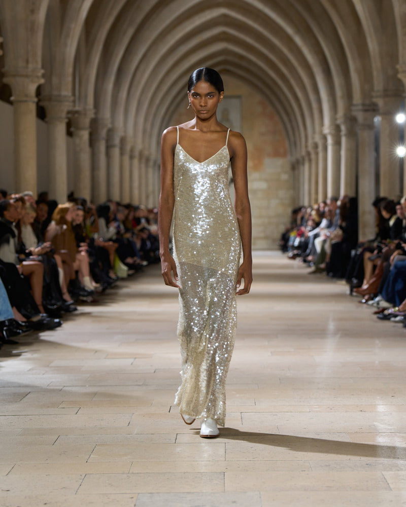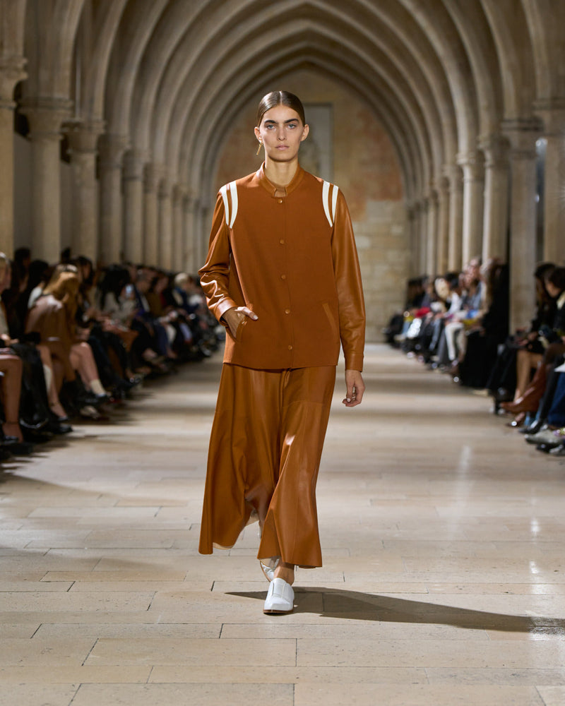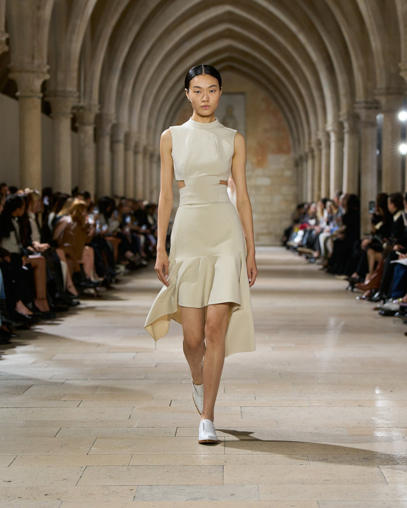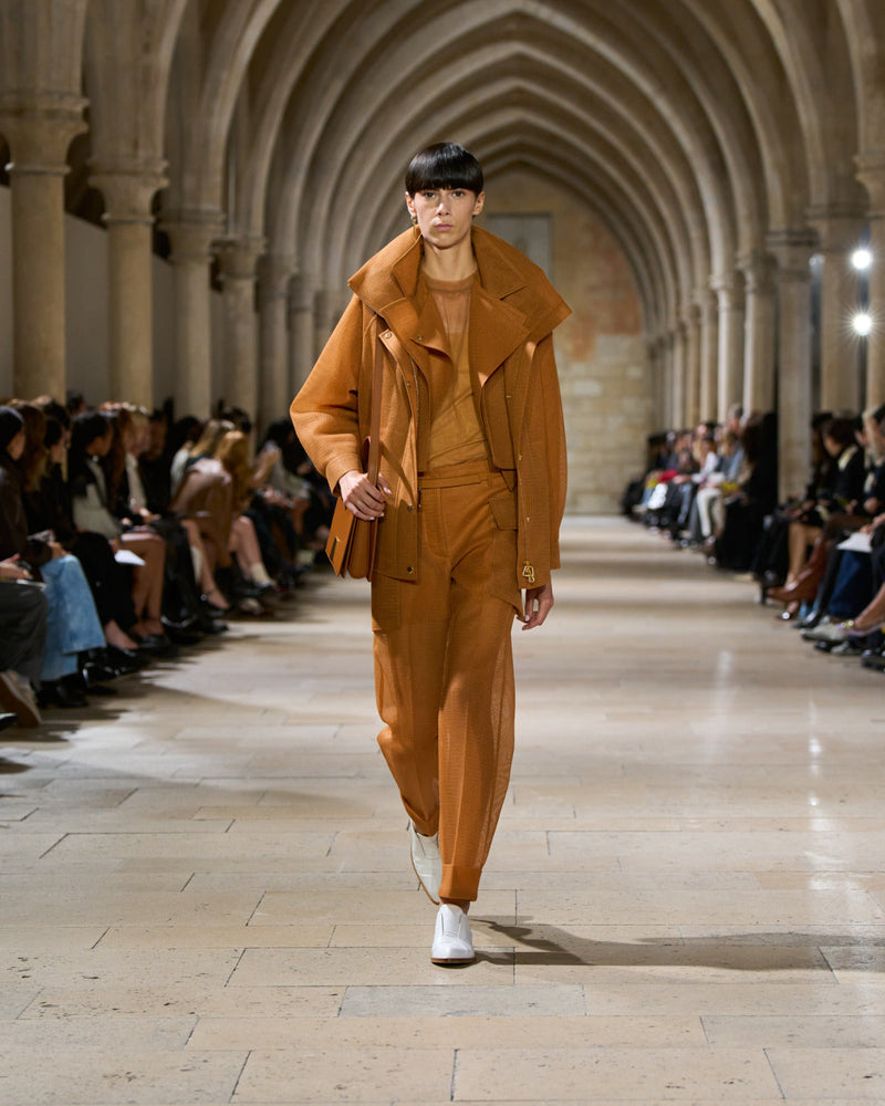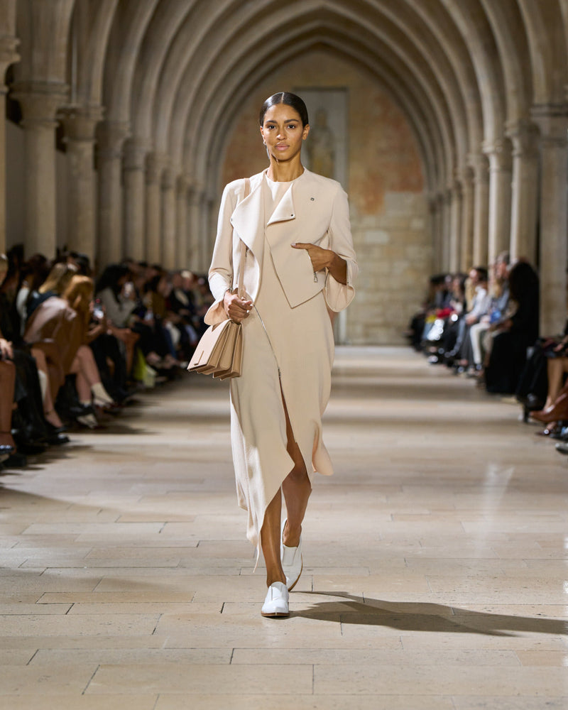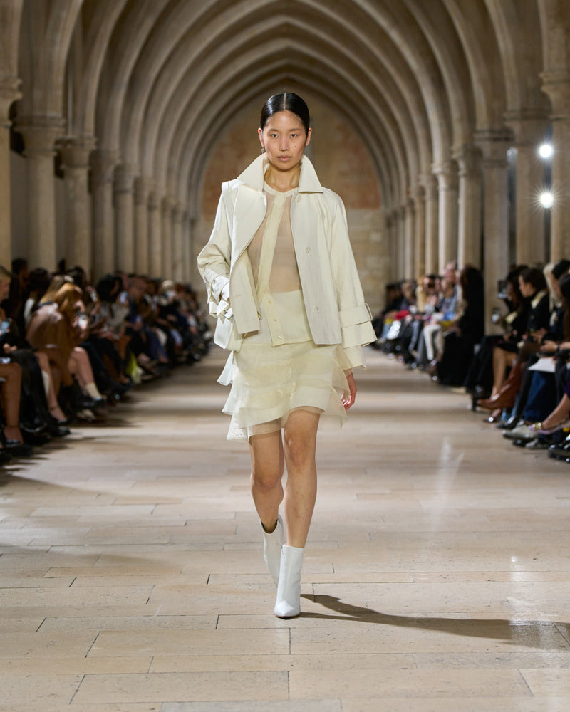 Juxtaposing flou and pragmatism. Elongated, fluid dresses grounded in trench coats and parkas for a feeling of protection and outdoorsy sleekness. Resin-coated, water-repellent, in fabrics that feel light: linen-blend, cotton, and silk poplin. Sporty ease expressed through double-layered tank tops, with a woman in action always present.
