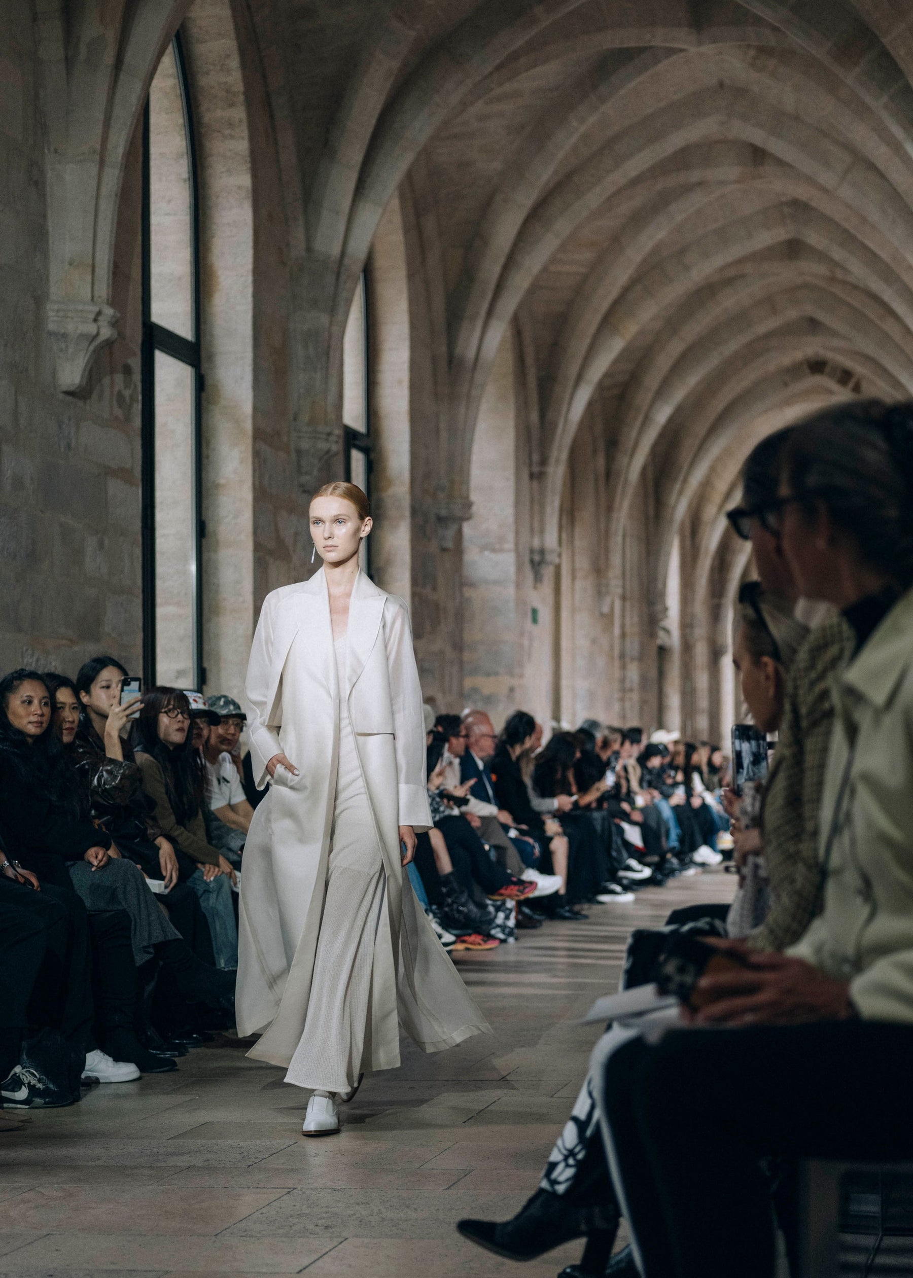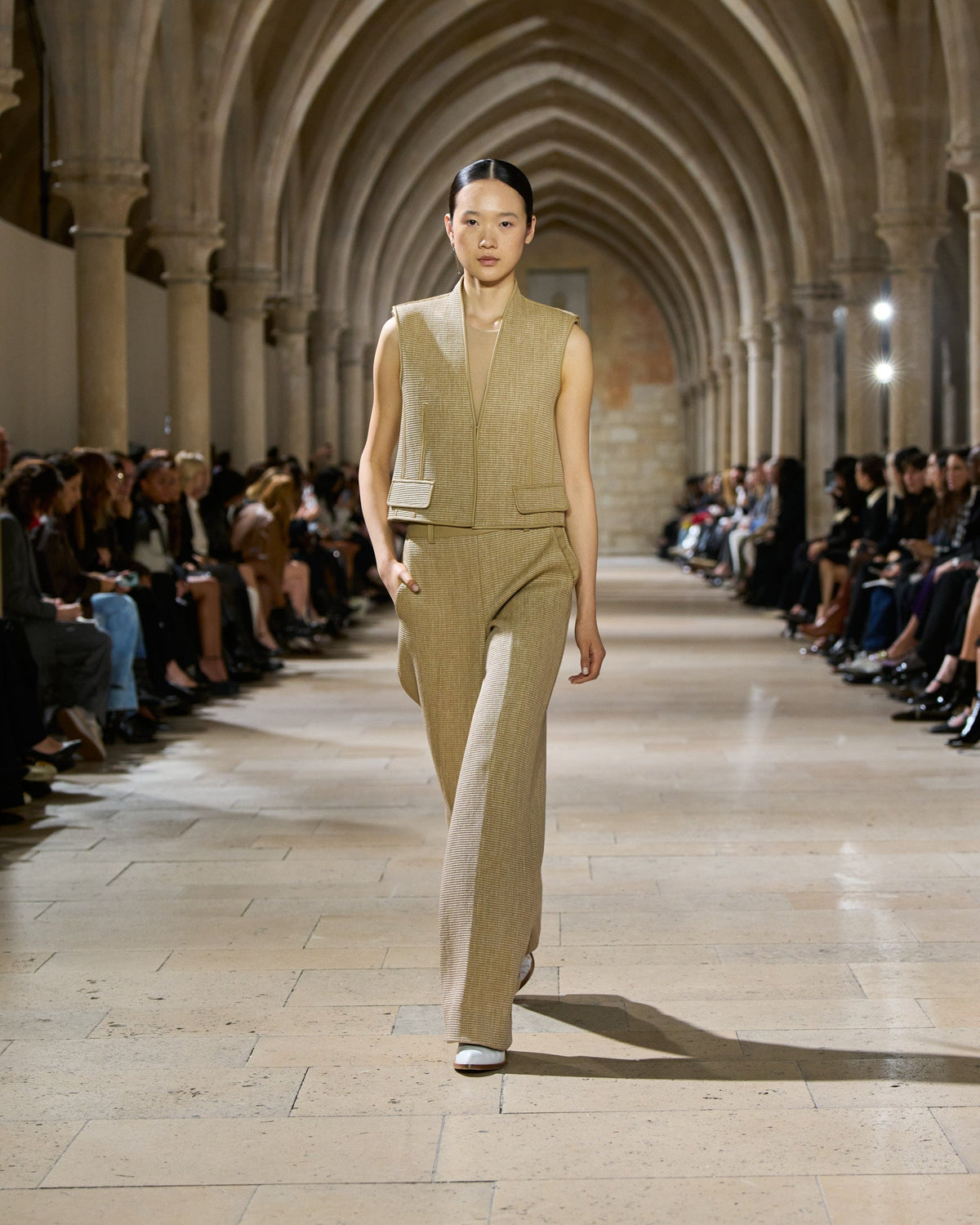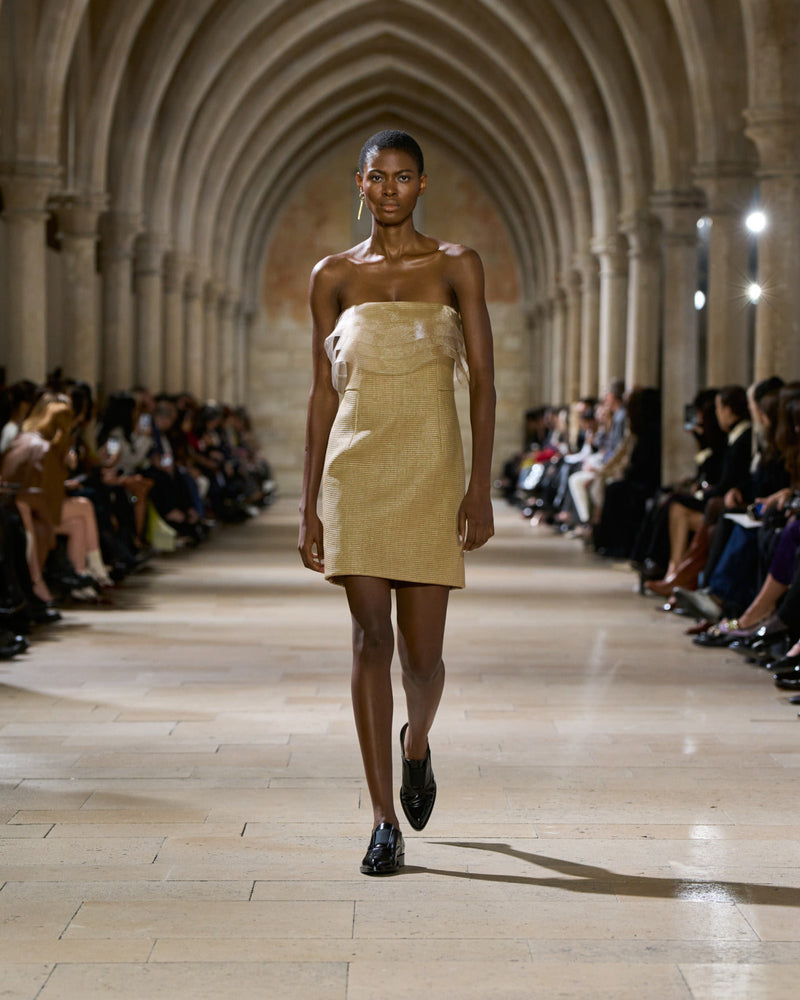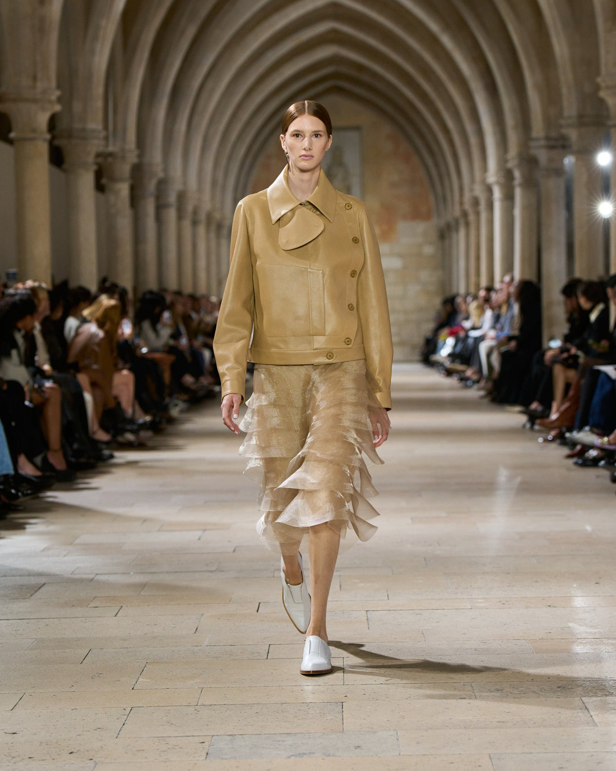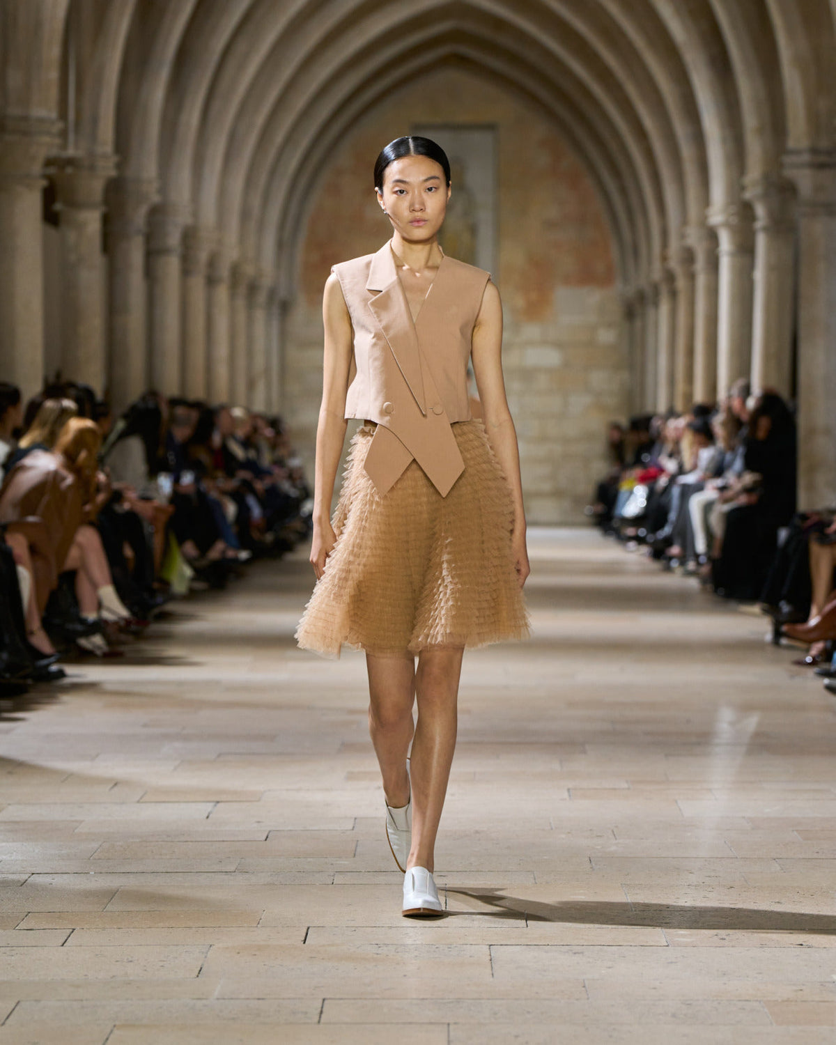 Juxtaposing flou and pragmatism. Elongated, fluid dresses grounded in trench coats and parkas for a feeling of protection and outdoorsy sleekness. Resin-coated, water-repellent, in fabrics that feel light: linen-blend, cotton, and silk poplin. Sporty ease expressed through double-layered tank tops, with a woman in action always present.